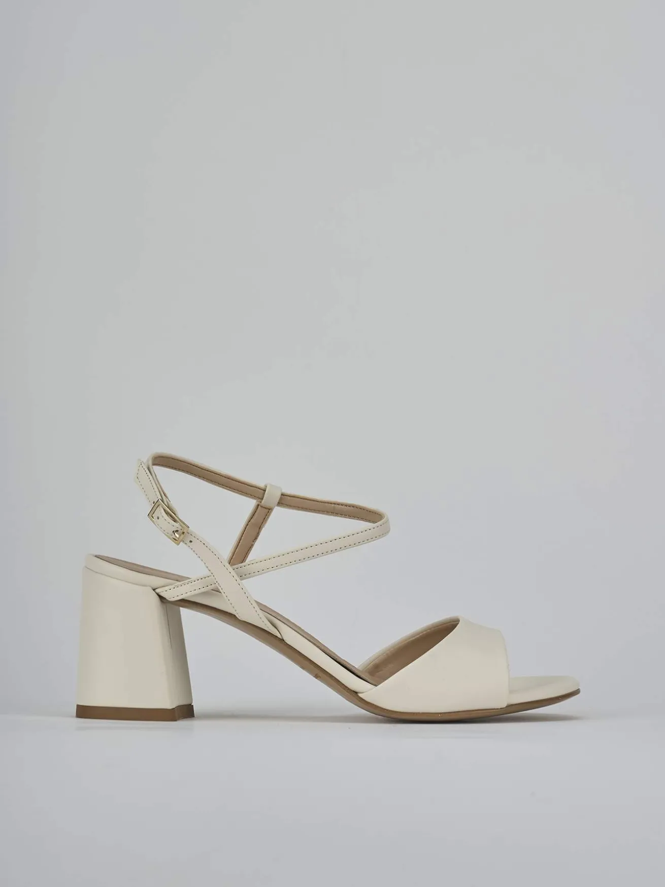 Sandalo tacco 9 cm fondo in leggerissima gomma e soletto interno in vera pelle. Tomaia in morbida pelle nappata, punta affsuolata, fascia unica con taglio cool, cinturino con fibbia regolabile e tacco grosso per il massimo del comfort.