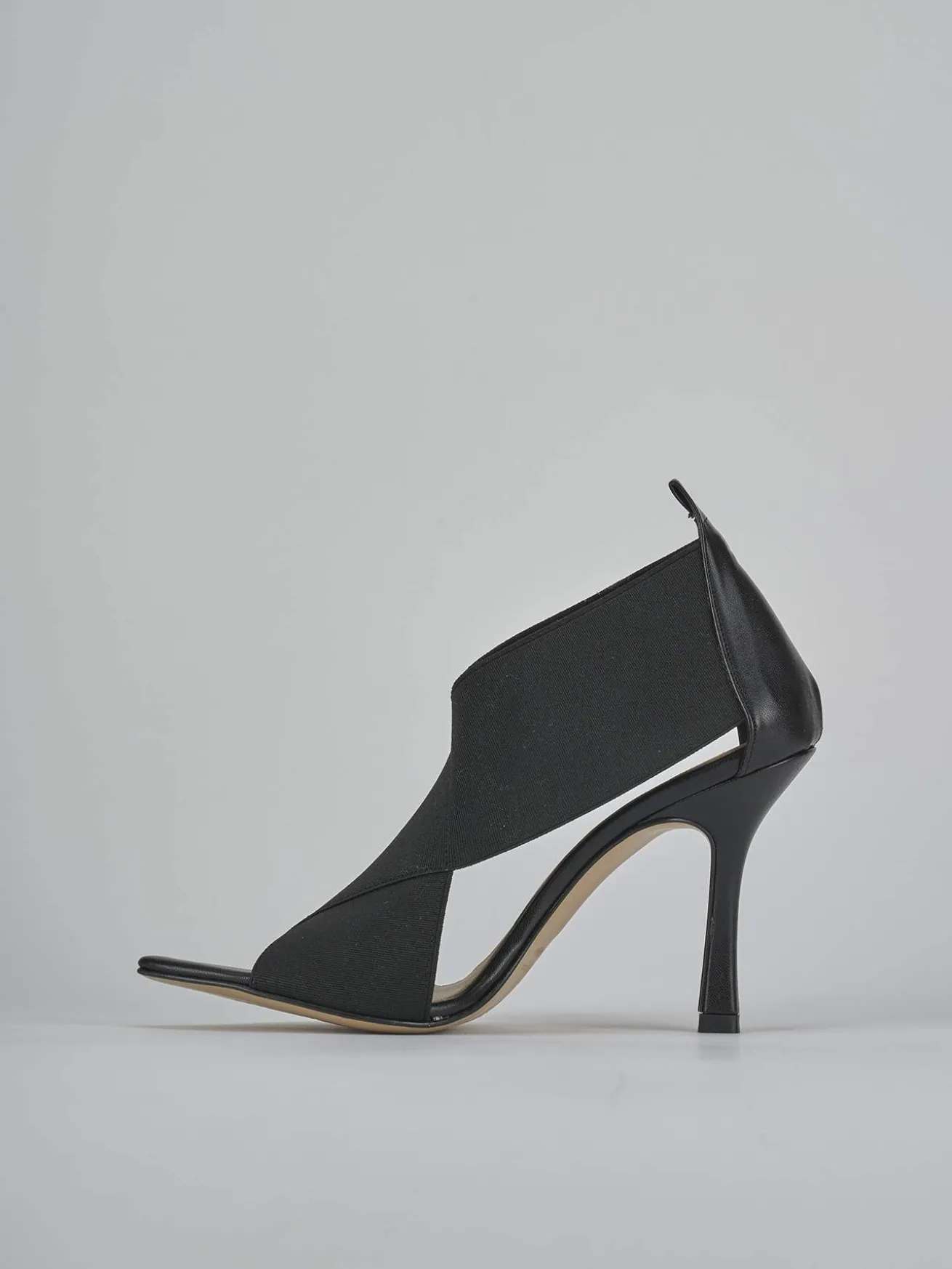 Sandalo tacco 9 cm fondo in leggerissima gomma e soletto interno in vera pelle. Tomaia in morbida pelle, punta sfilata, fasce elasticizzate spesse incrociate che avvolgono il piede e tacco rocchetto. Per un look che ti farà notare.