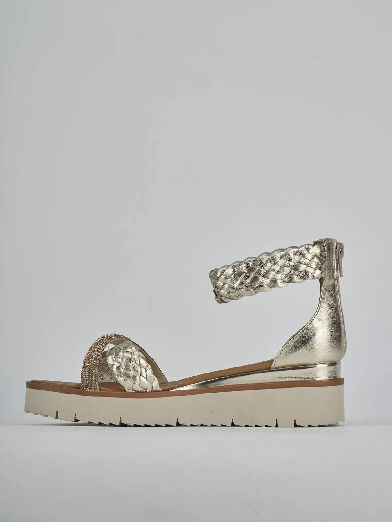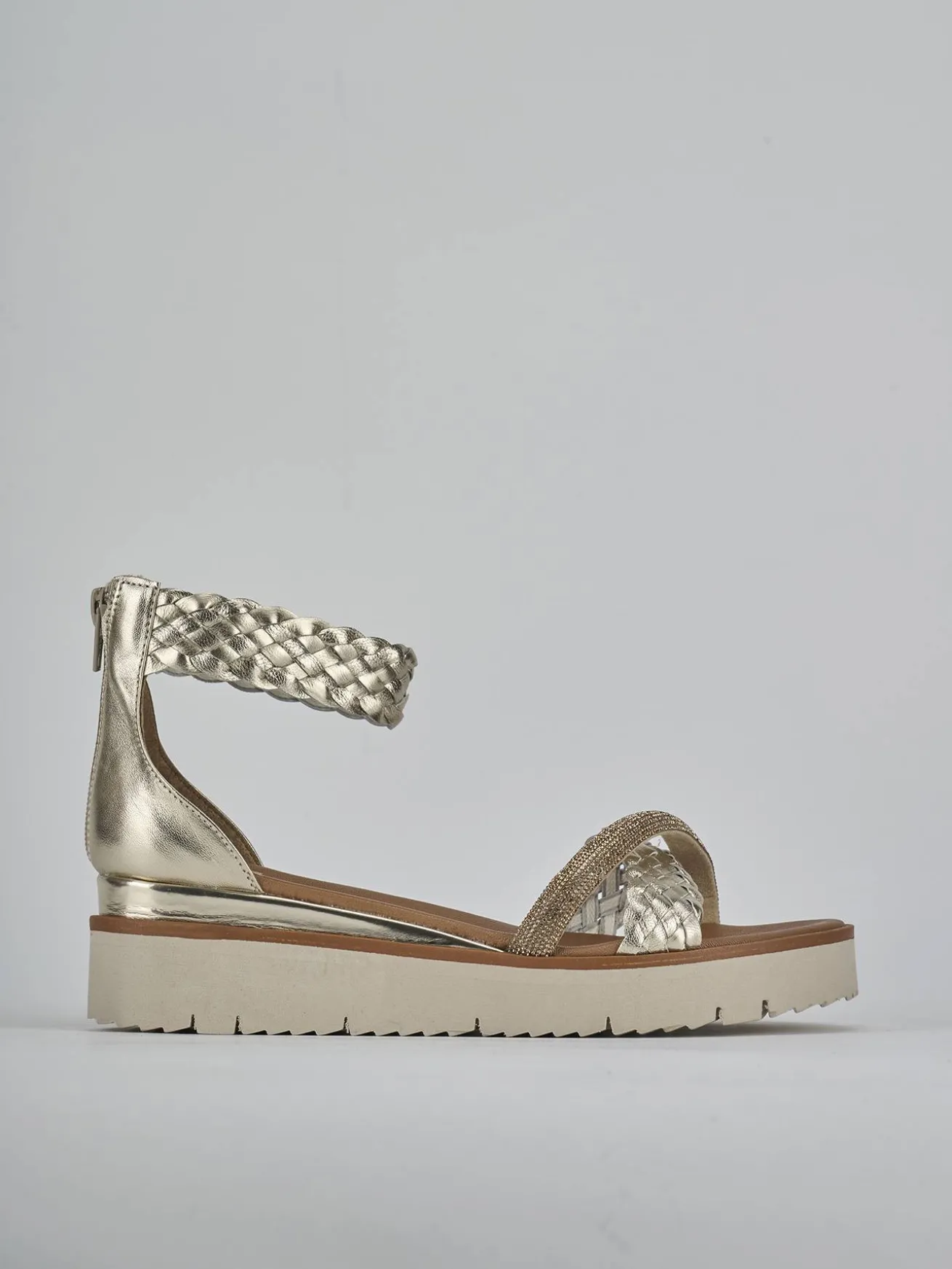 Sandalo zeppa 2 fondo in leggera gomma e soletto interno in vera pelle. Tomaia in morbida pelle finemente intrecciata, punta affusolata, due fasce incrociate, cinturino spesso e comoda cerniera posteriore. Dal design che non tramonta mai.