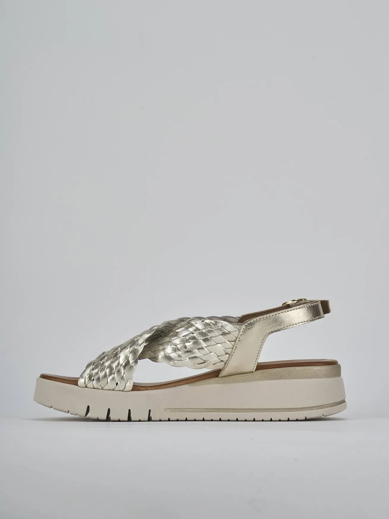 Sandalo zeppa 2 cm fondo in leggera gomma e soletto interno in vera pelle. Tomaia in morbida pelle, punta affusolata, fasce larghe intrecciate, cinturino con fibbia regolabile. Perfetto per tutte le tue occasioni.