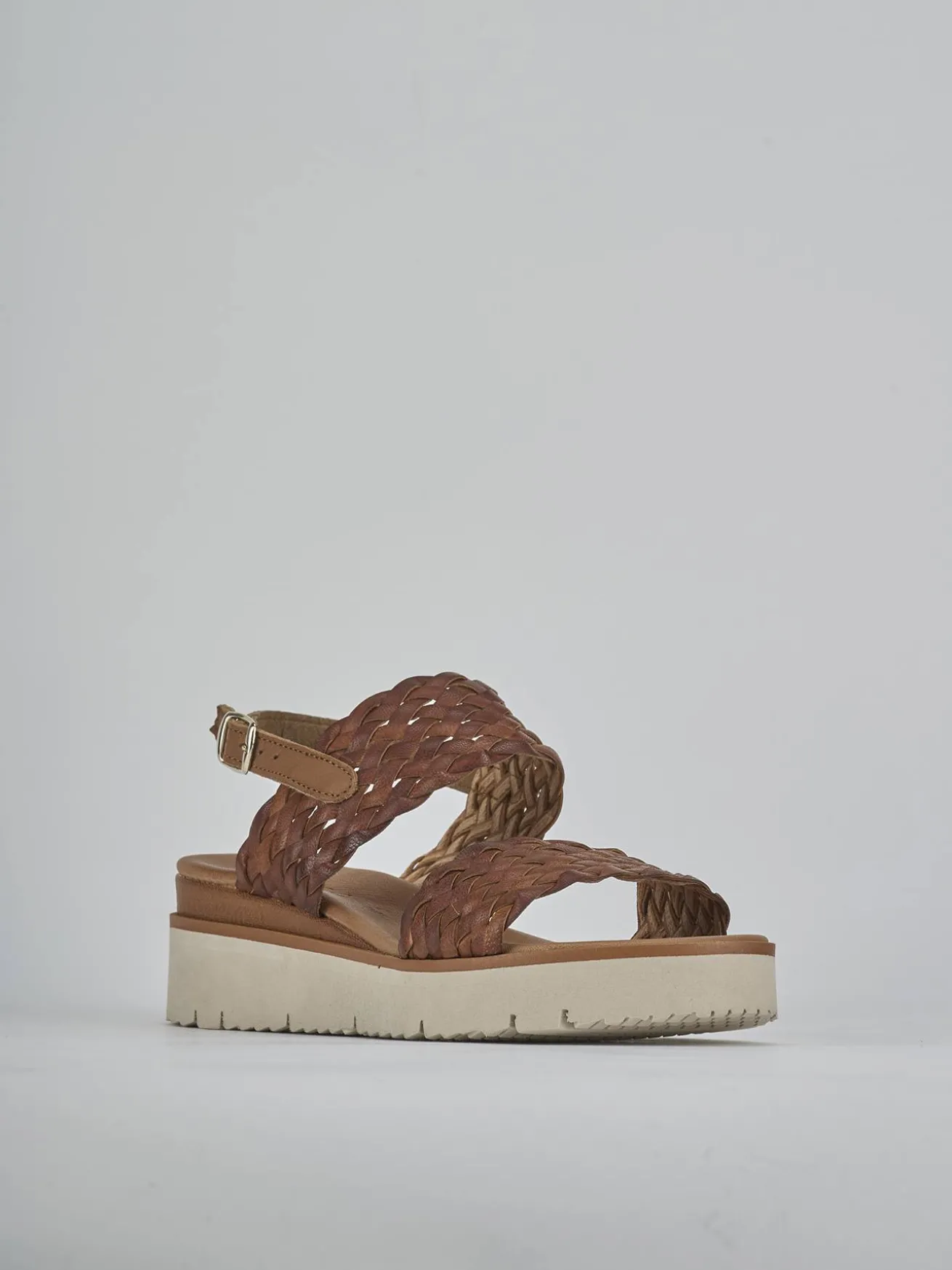Sandalo zeppa 3 fondo in leggerissima gomma e soletto interno in vera pelle. Tomaia in morbida pelle nappata finemente intrecciata, punta affusolata, fasce e cinturino con fibbia regolabile. Versatile per ogni tua occasione.