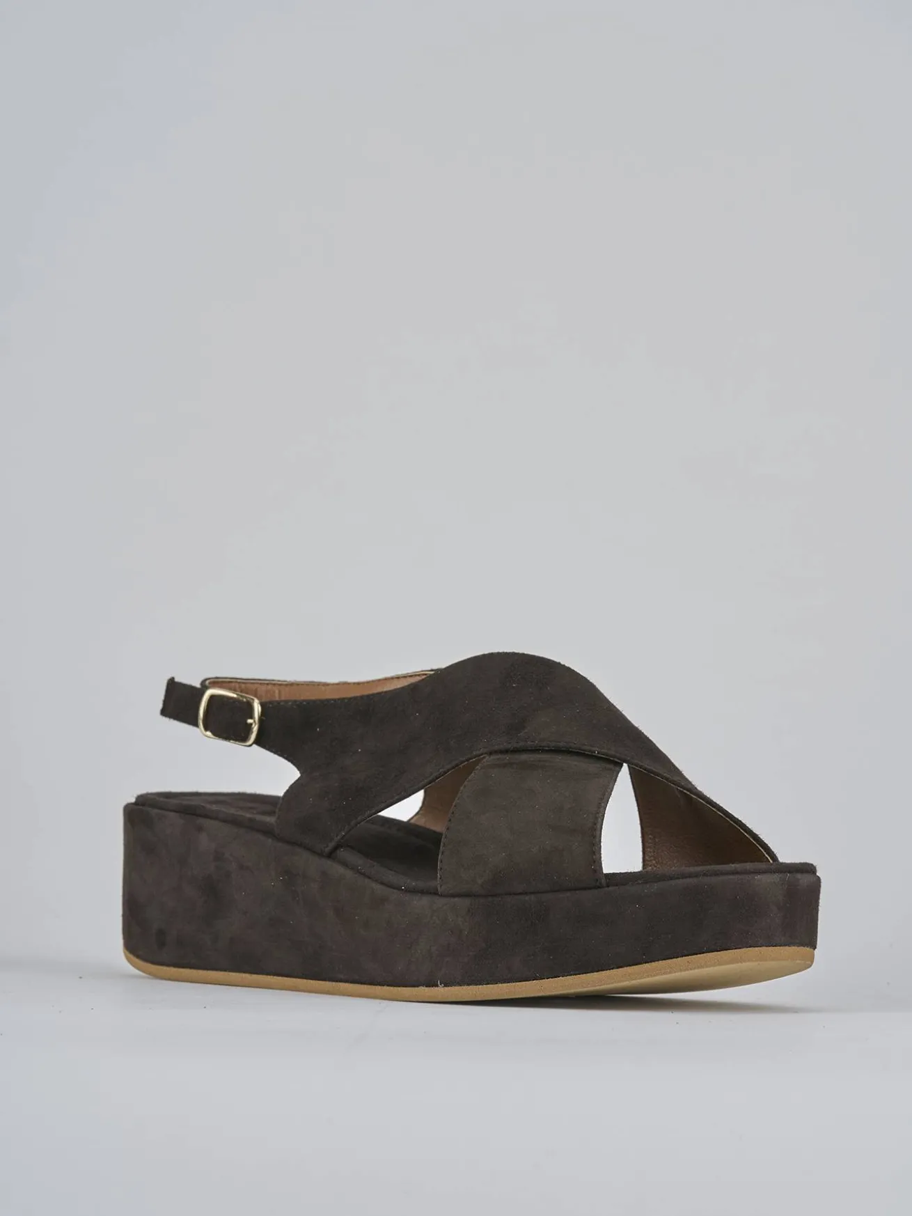 Sandalo zeppa 4 cm fondo in cuoio e soletto interno in vera pelle e leggermente imbottito. Tomaia in morbida pelle scamosciata, punta leggermente squadrata, fasce incrociate, cinturino con fibbia regolabile e piccolo plateau anteriore di 1.5 cm . Perfetto con un vestito o una gonna midi.