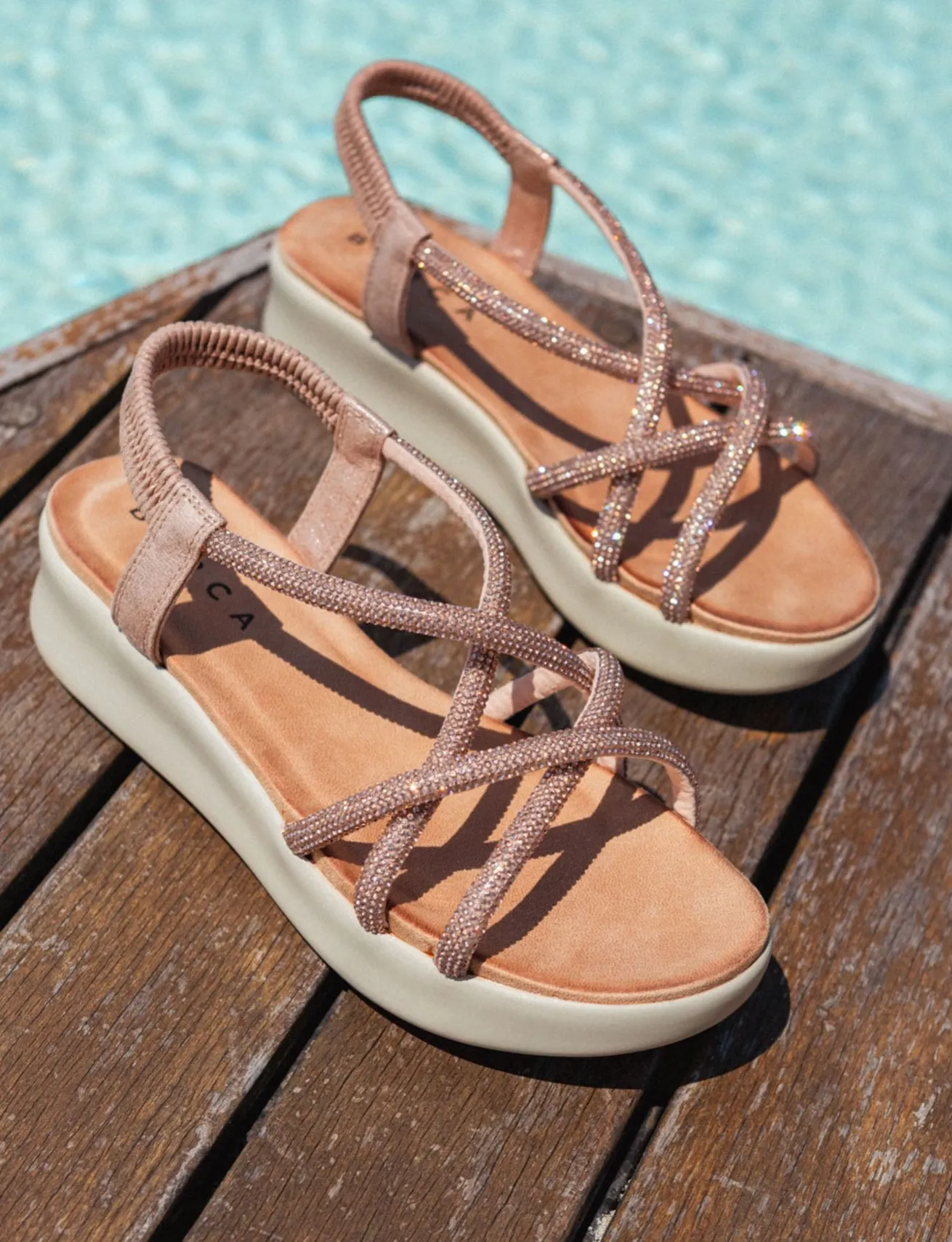Sandalo zeppa 4 cm fondo in leggera gomma e soletto interno in vera pelle. Tomaia in morbida pelle foderata in tessuto, punta affusolata, fasce sottili incrociate con strasse cinturino elasticizzato. Piccolo plateau antriore di 2 cm per il massimo del comfort.