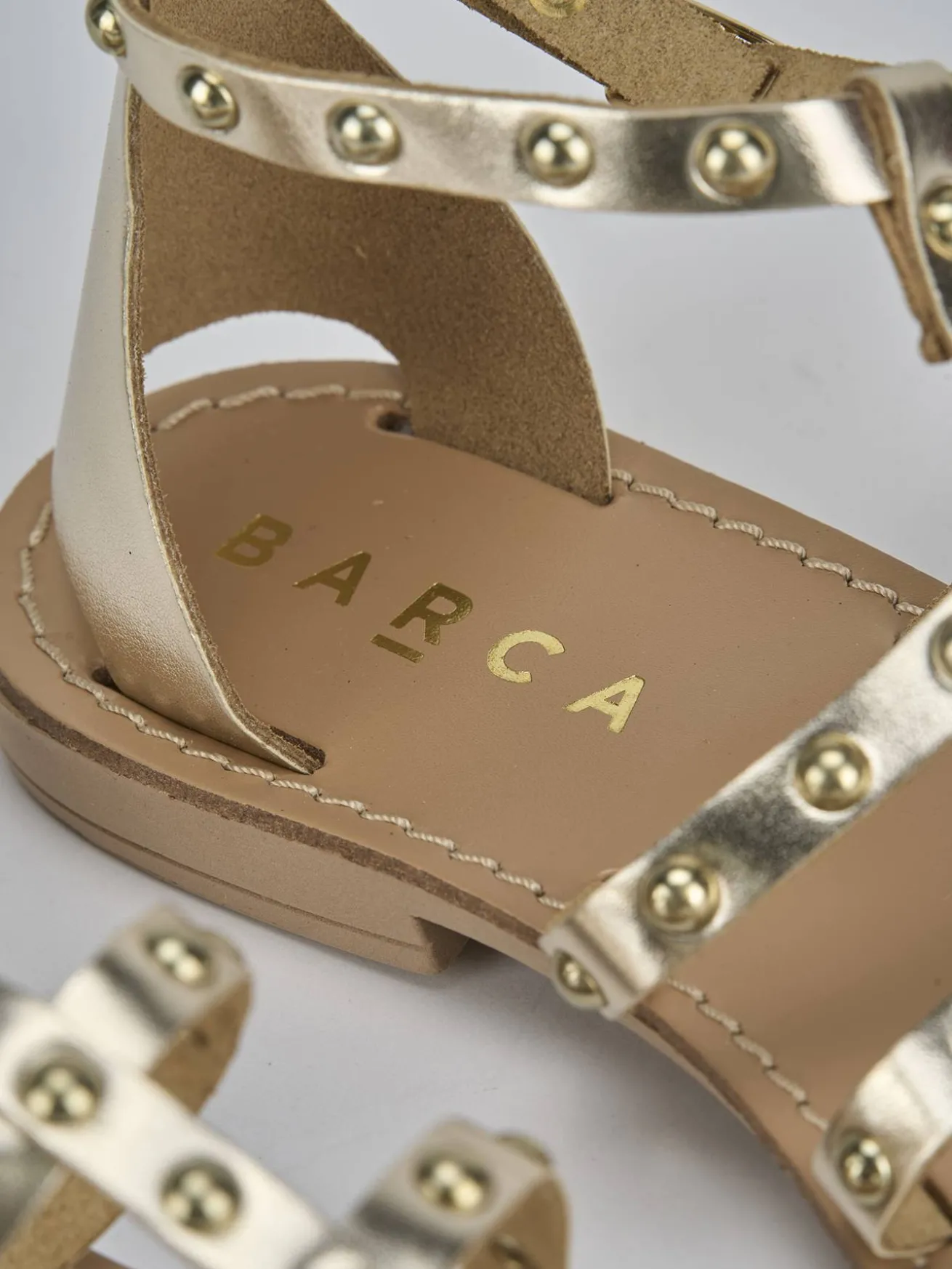 Questo sandalo in oro laminato presenta un tacco basso di 1 cm, ideale per chi desidera comodità senza rinunciare allo stile.