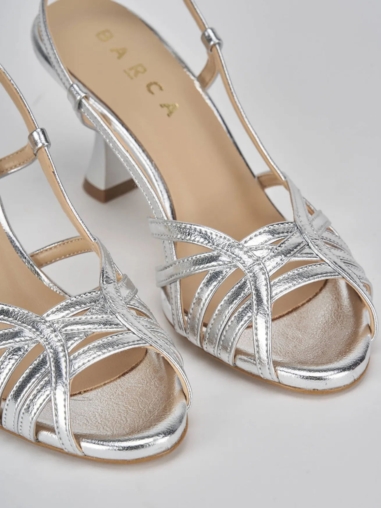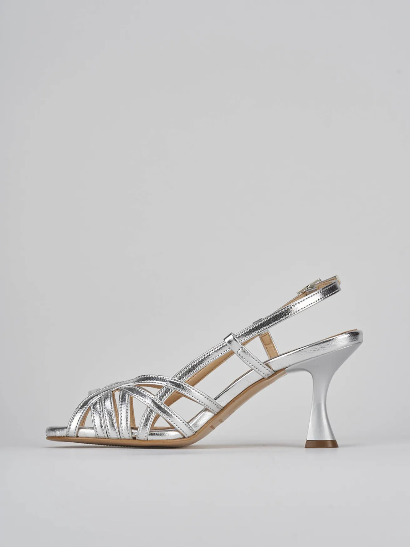 Sandalo tacco 7 cm, fondo in leggerissima gomma e soletto interno in vera pelle. Tomaia in morbida pelle effetto laminato, punta affusolata e fascia unica intrecciata in punta, cinturino che prende il collo del piede con chiusura una fibia regolabile e stabile tacco rocchetto.
