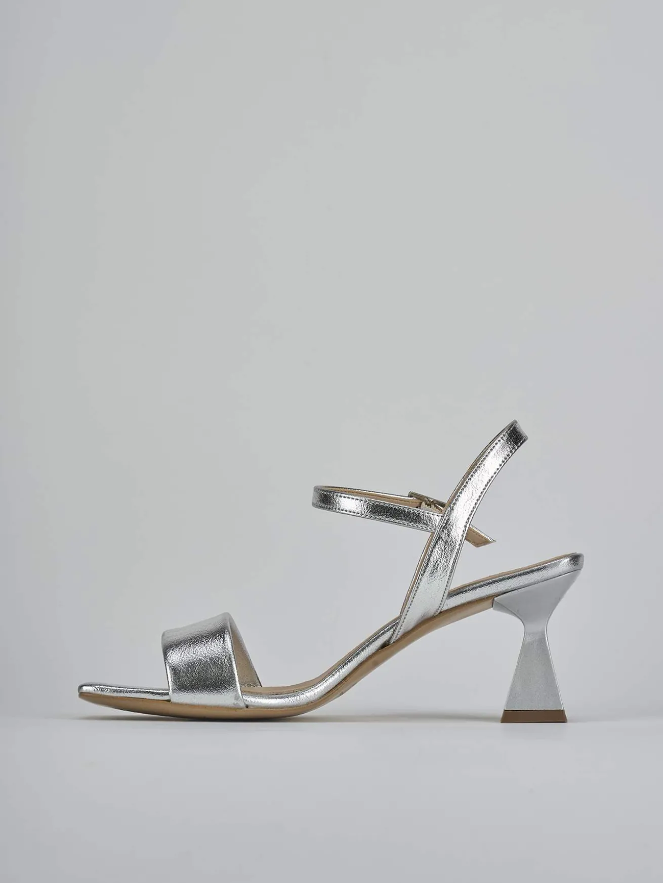 Sandalo tacco 7 cm, fondo in leggerissima gomma e soletto interno in vera pelle. Tomaia in morbida pelle laminata, punta squadrata, fascia unica in punta, cinturino con fibbia regolabile in caviglia e nuovissimo tacco rocchetto per un look chic.