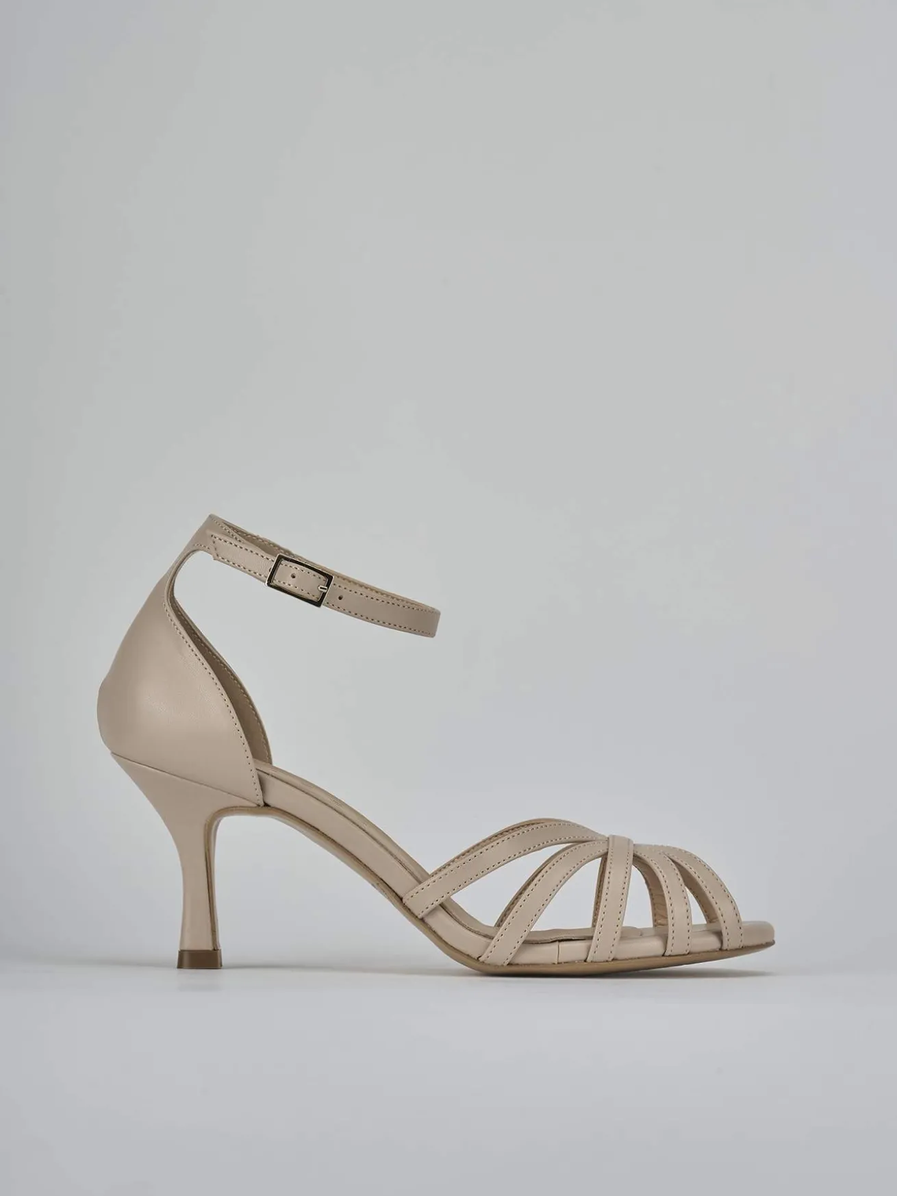 Sandalo tacco 7 cm, fondo in leggerissima gomma e soletto interno in vera pelle. Tomaia in morbida nappa, punta affusolata con fascia a cestina aperta in punta, cinturino in caviglia con fibbia regolabile e tallone chiuso. per un look so-cool!