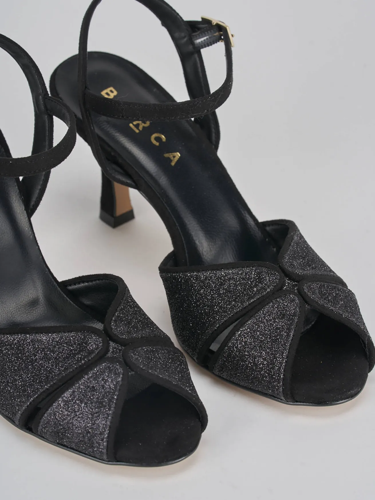 Sandalo tacco 7 cm, fondo in leggerissima gomma e soletto interno in vera pelle. Tomaia in morbida pelle foderata da tessuto glitterato, fascia unica intrecciata in punta, cinturino in caviglia con fibia regolabile e tallone aperto, per ogni tua serata.