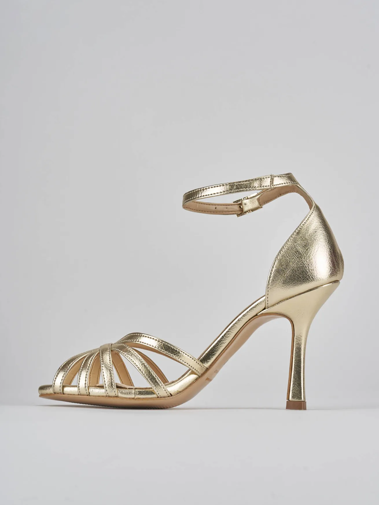 Sandalo tacco 9 cm, fondo in leggerissima gomma e soletto interno in vera pelle. Tomaia in morbida pelle effetto laminato, punta affusolata, fascia a intreccio in punta e cinturino in caviglia con fibia regolabile, tallone chiuso. Per un look super glamour.