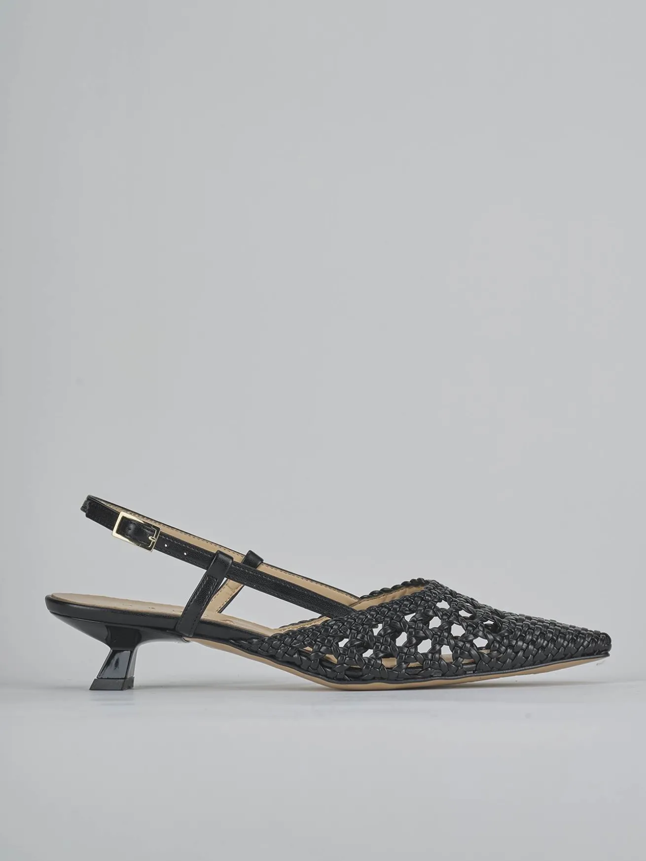 Slingback decolte’ tacco 4 cm fondo in leggerissima gomma e soletto interno in vera pelle. Tomaia in morbida pelle intrecciata, punta sfilata, puntale, cinturino con fibbia regolabile per un fit perfetto. Nuovissimo tacco rocchetto per un look chic.