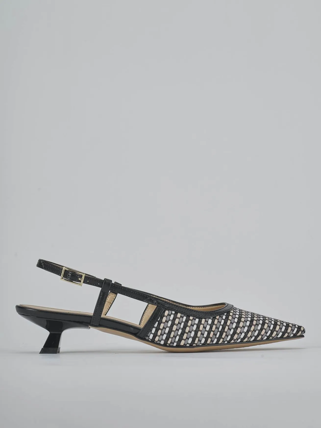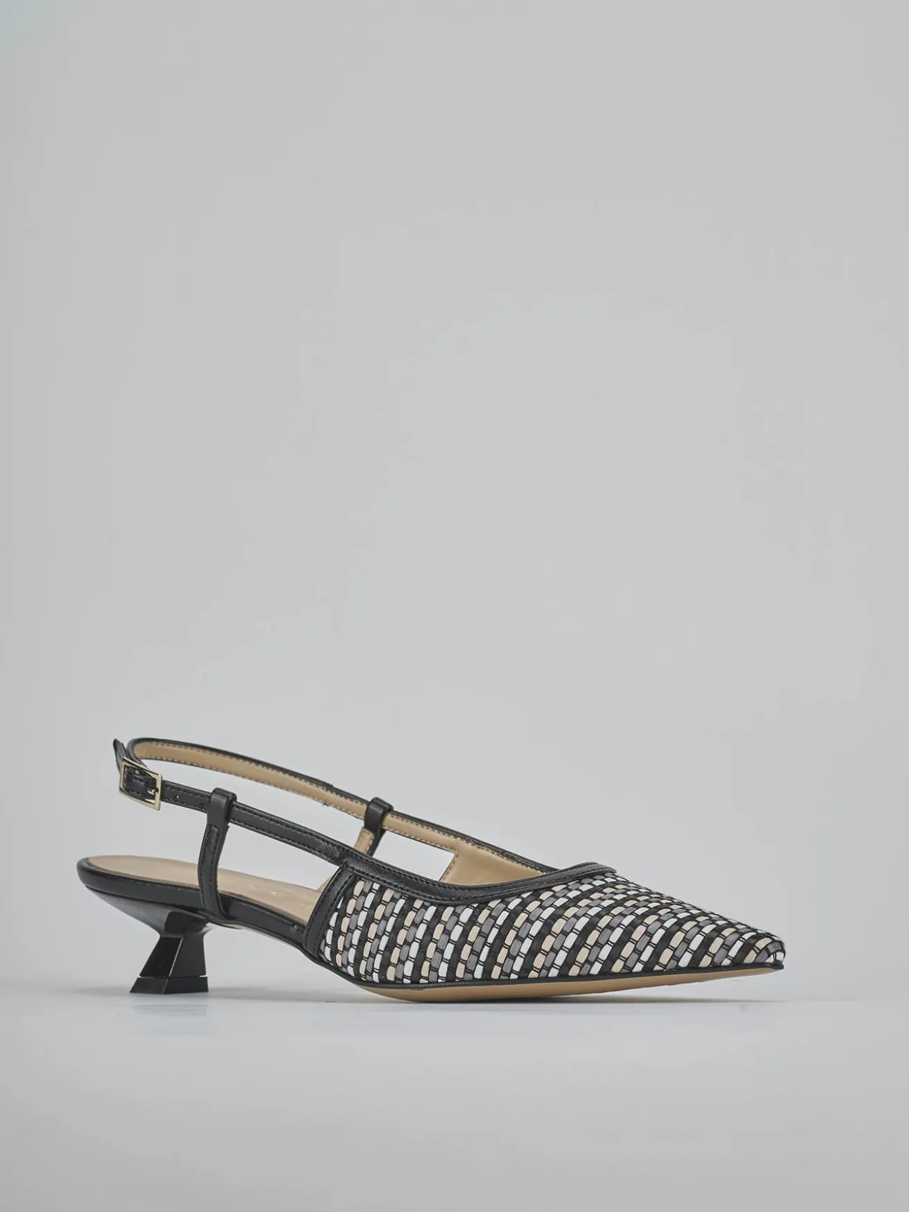 Slingback decolte’ tacco 4 cm fondo in leggerissima gomma e soletto interno in vera pelle. Tomaia in morbida pelle foderata in juta, punta sfilata, scollo morbido, bordo a rinforzo, cinturino con fibbia regolabile e tacco rocchetto. Per un look cool.