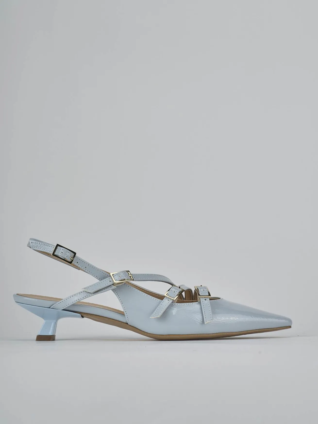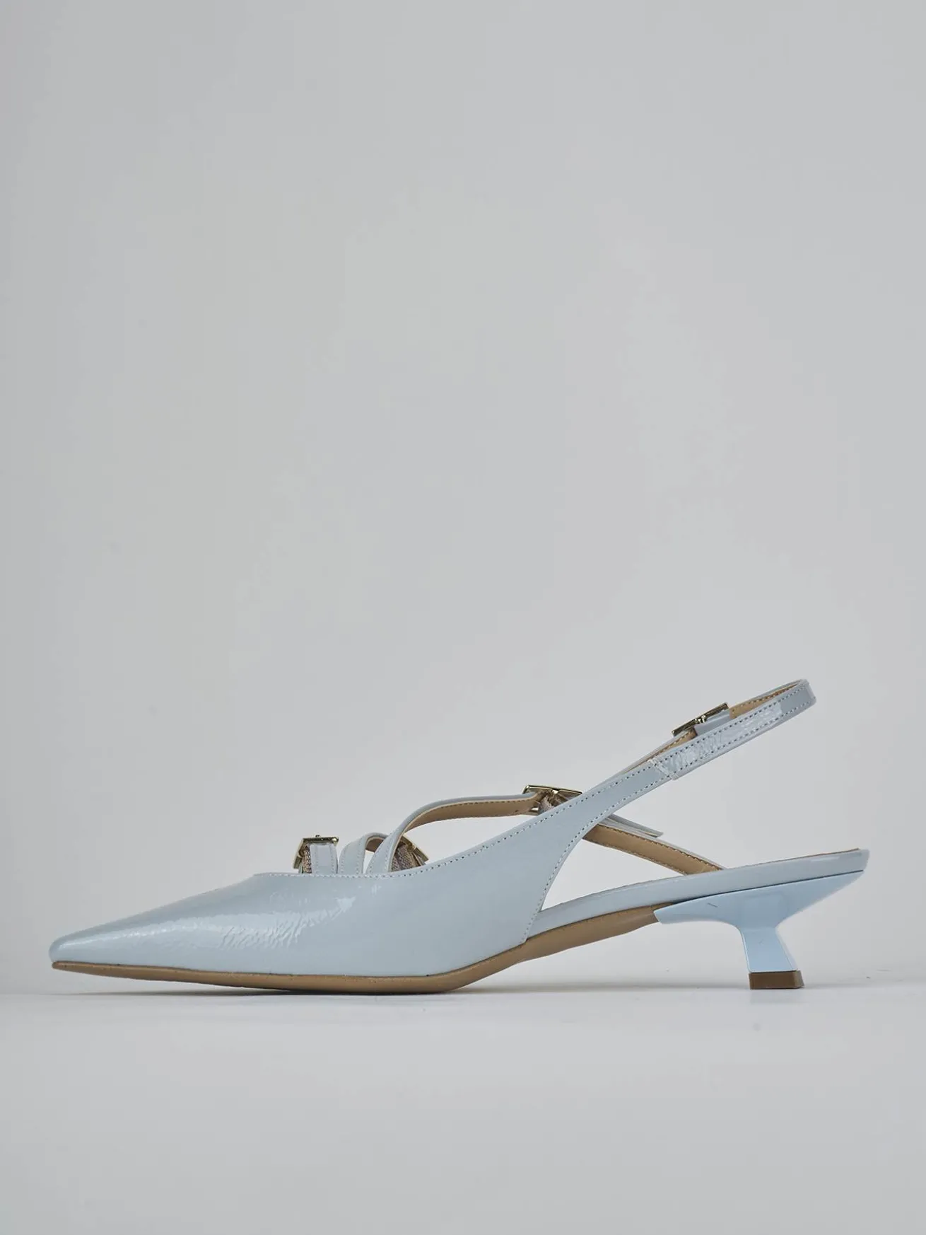 Slingback decolte’ tacco 4 cm fondo in leggerissima gomma e soletto interno in vera pelle. Tomaia in morbida pelle effetto verniciato, punta sfilata, scollo morbido a ‘U’, tre cinturini con fibbia regolabile e cinturino sottile sul tallone. Nuovissimo tacco rocchetto per un look cool.