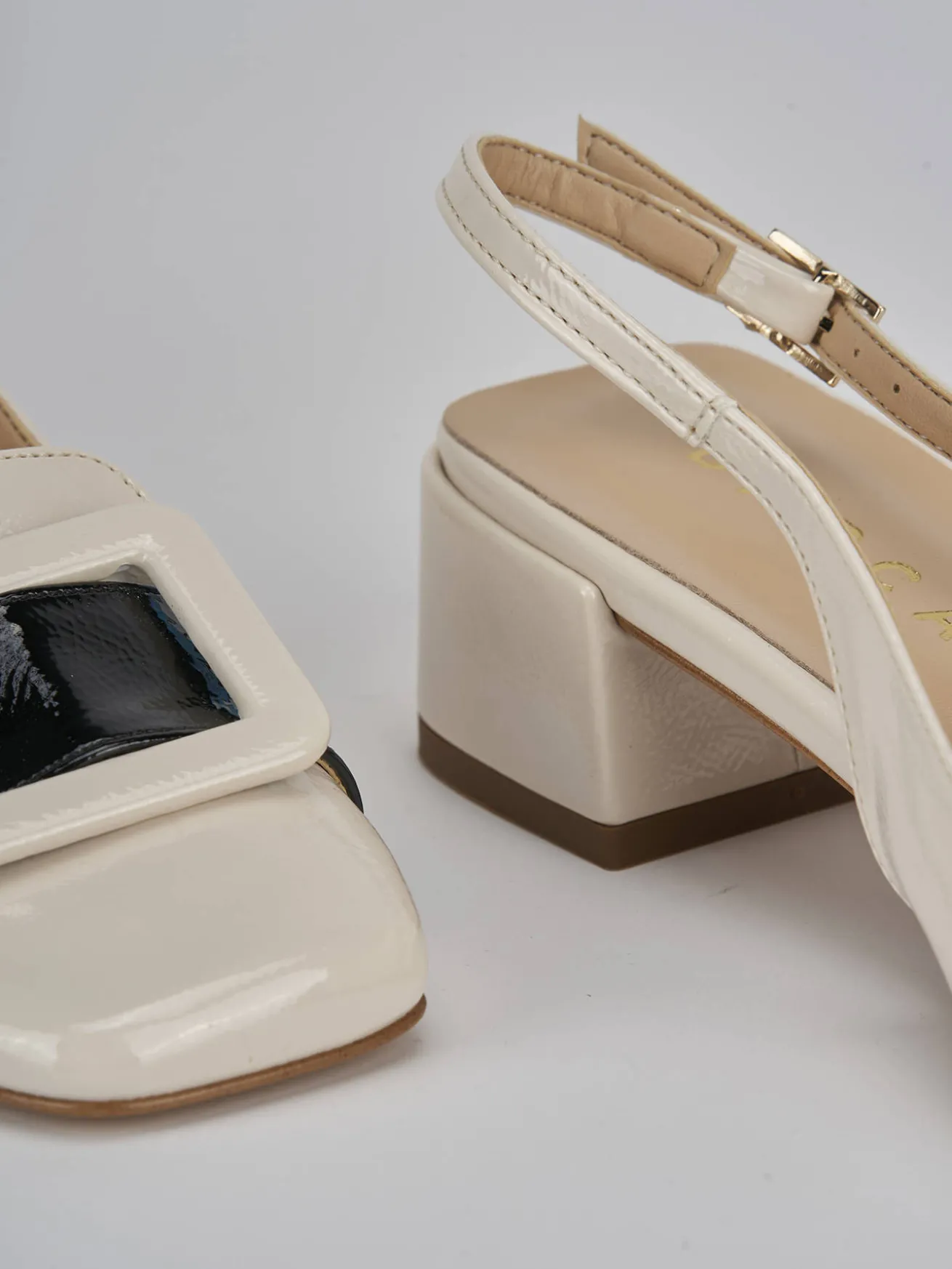 Slingback tacco 4 cm fondo in cuoio e soletto interno in vera pelle. tomaia in morbida pelle effetto verniciato, punta squadrata, accessorio, bicolor, cinturino con fibbia regolabile e tacco grosso per il massimo del comfort.