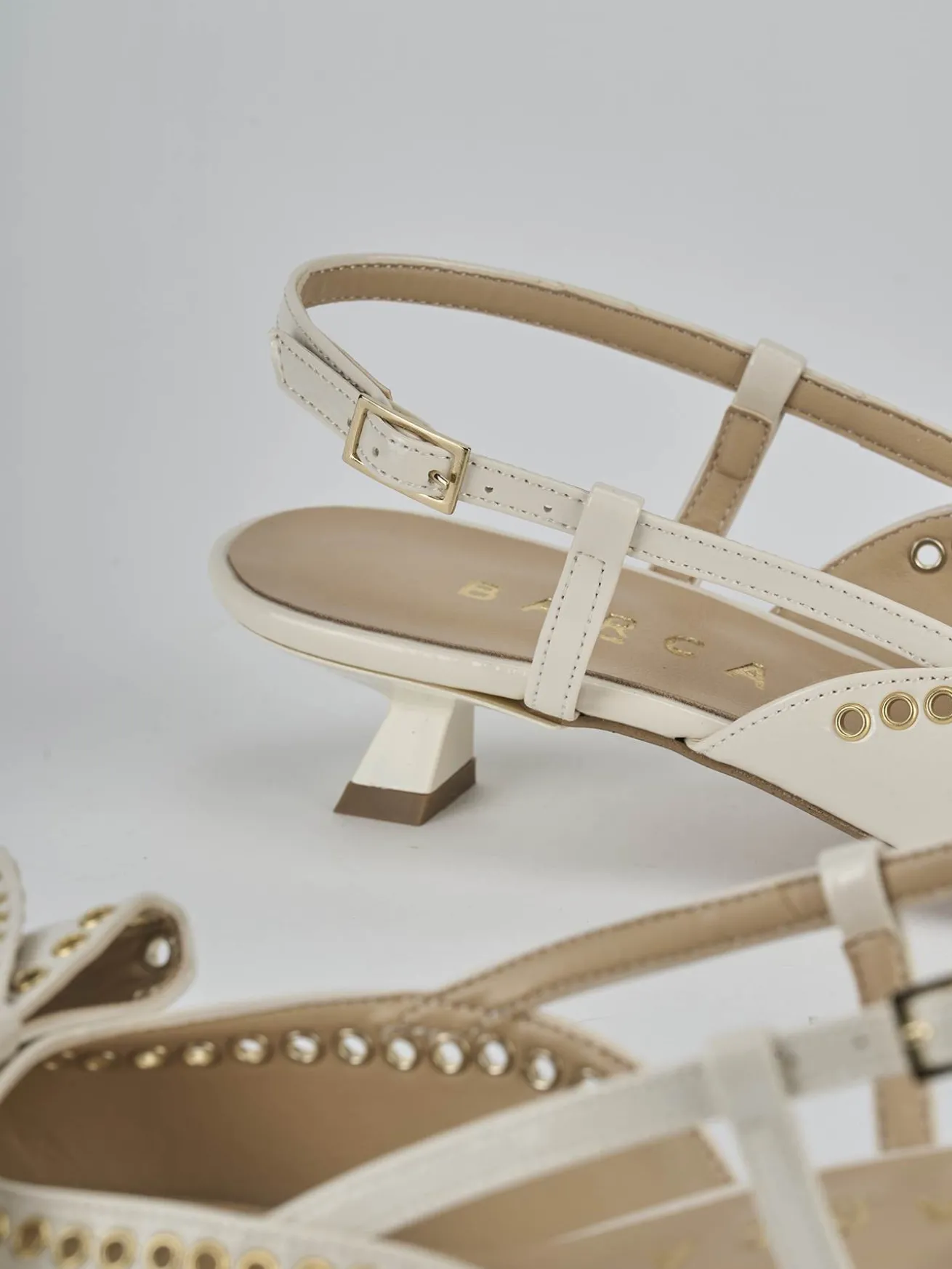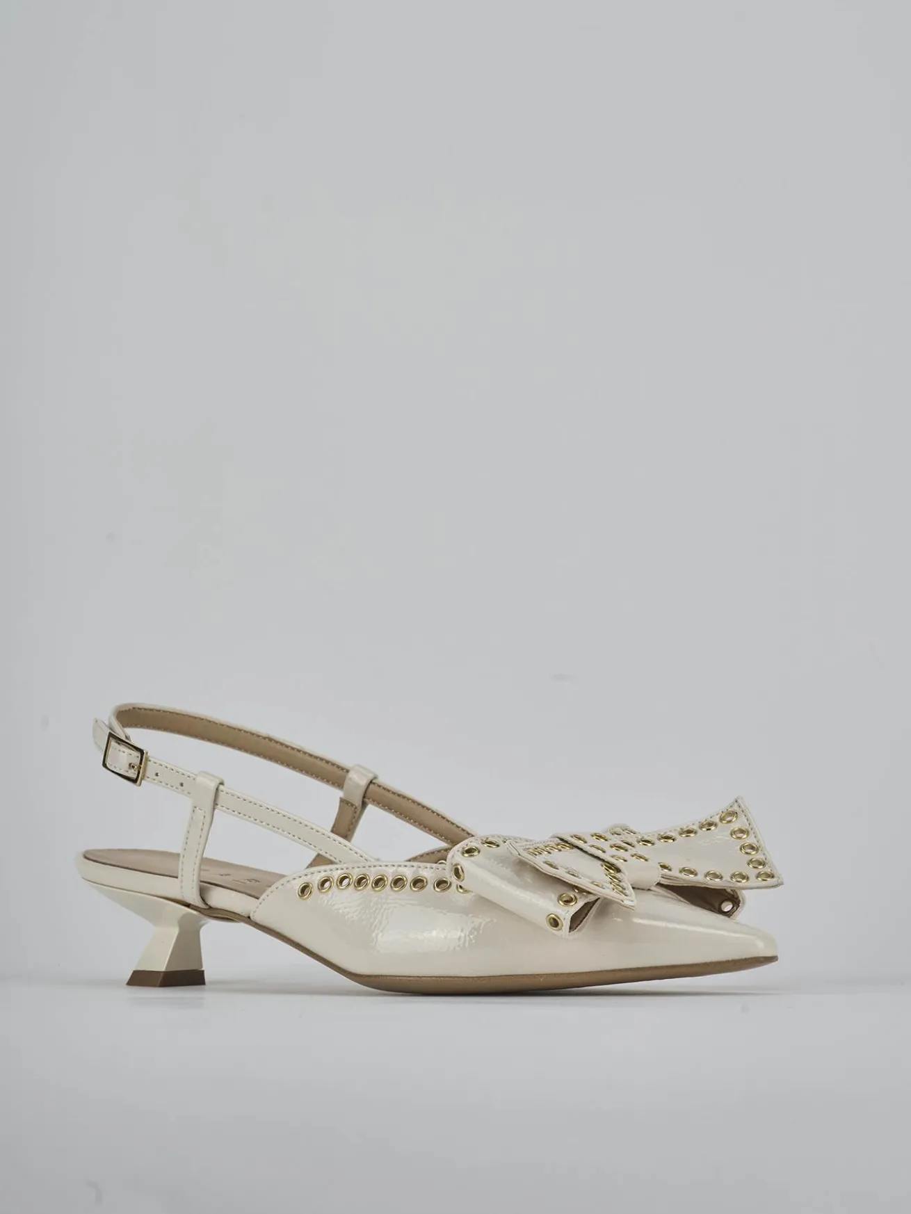 Slingback decolte’ tacco 4 cm fondo in leggerissima gomma e soletto interno in vera pelle. Tomaia in morbida pelle effetto verniciato, punta sfilata, fiocco, borchie forate, cinturino con fibbia regolabile e tacco rocchetto. Perfetto con un vestito lungo.