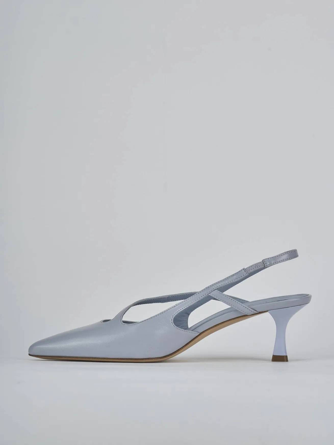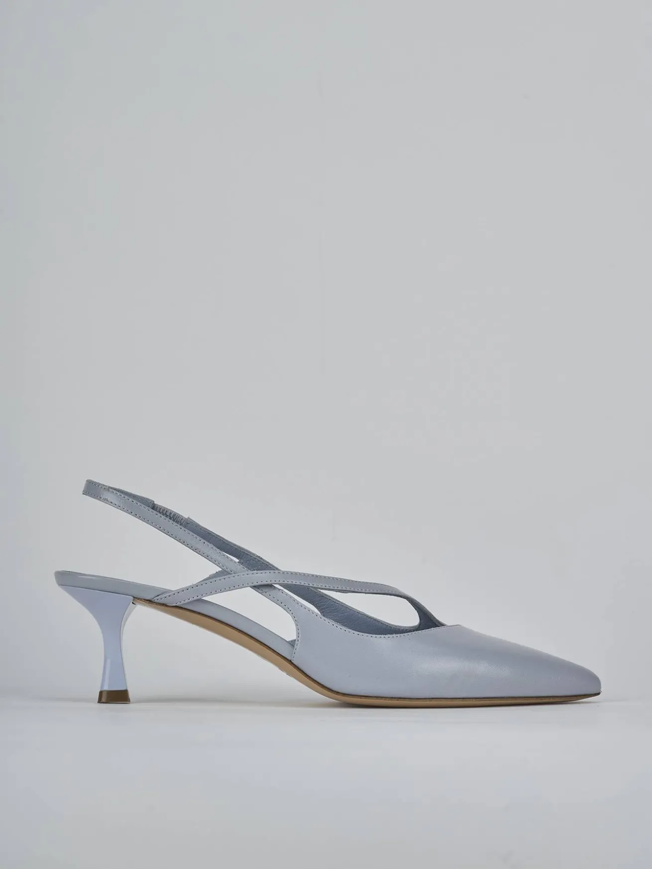 Slingback decolte’ tacco 5 cm fondo in cuoio e soletto interno in vera pelle. Tomaia in morbida pelle effetto verniciato, punta sfilata, scollo morbido squadrato, cinturino a incrocio e cinturino elasticizzato per il massimo del comfort. Nuovissimo tacco rocchetto.