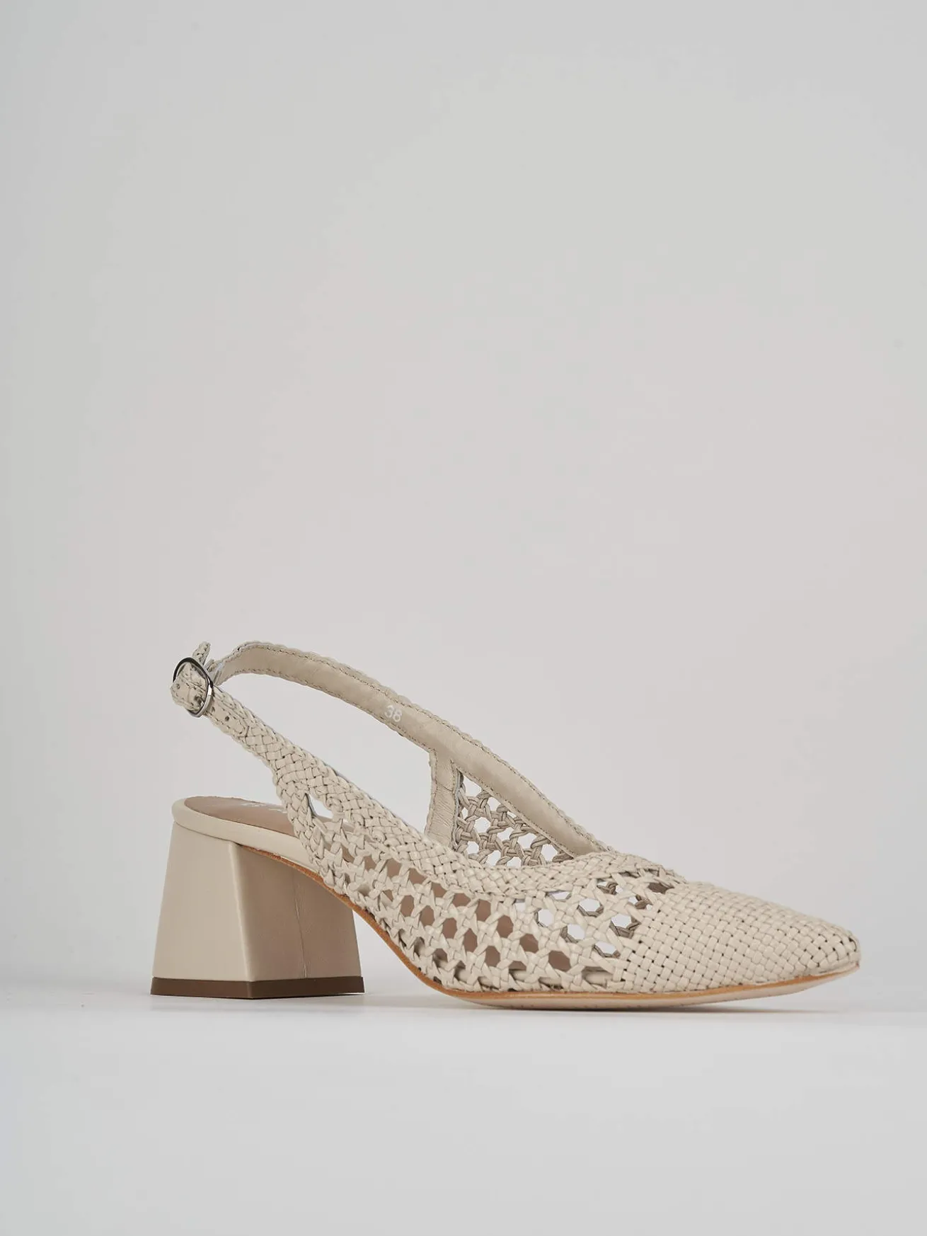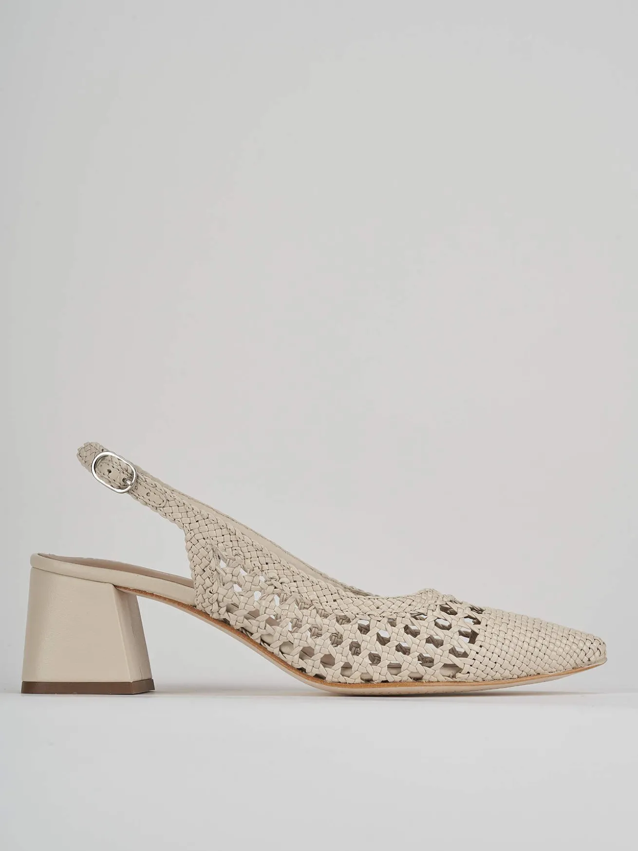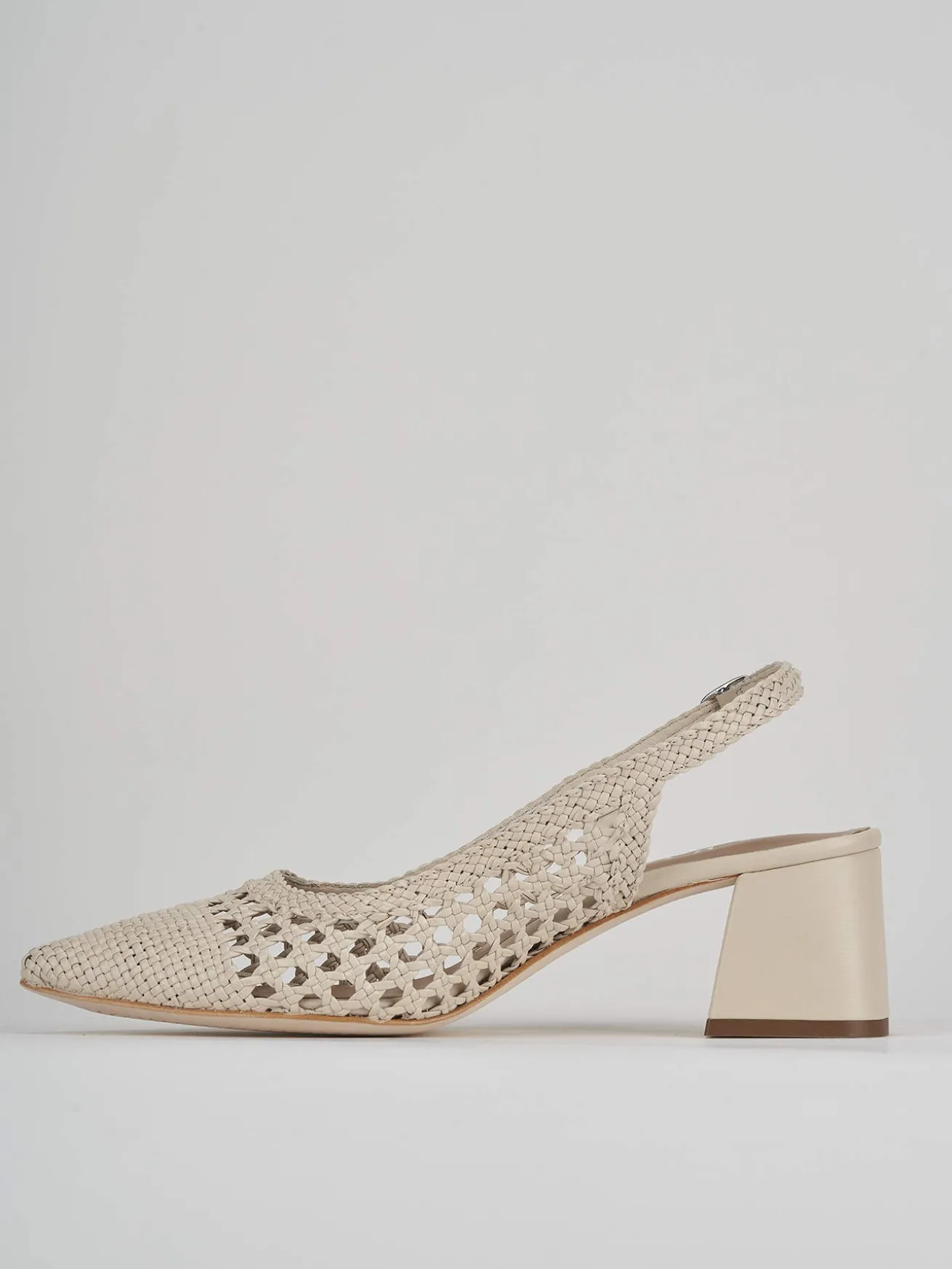 Slingback decolte tacco 5 cm fondo cuoio e soletto interno in vera pelle. tomaia in morbida pelle intrecciata artigianalmente, punta sfilata e chiusura con cinghietta posteriore per un look cool-chic. Tacco stabile adatto ad ogni momento della tua giornata.