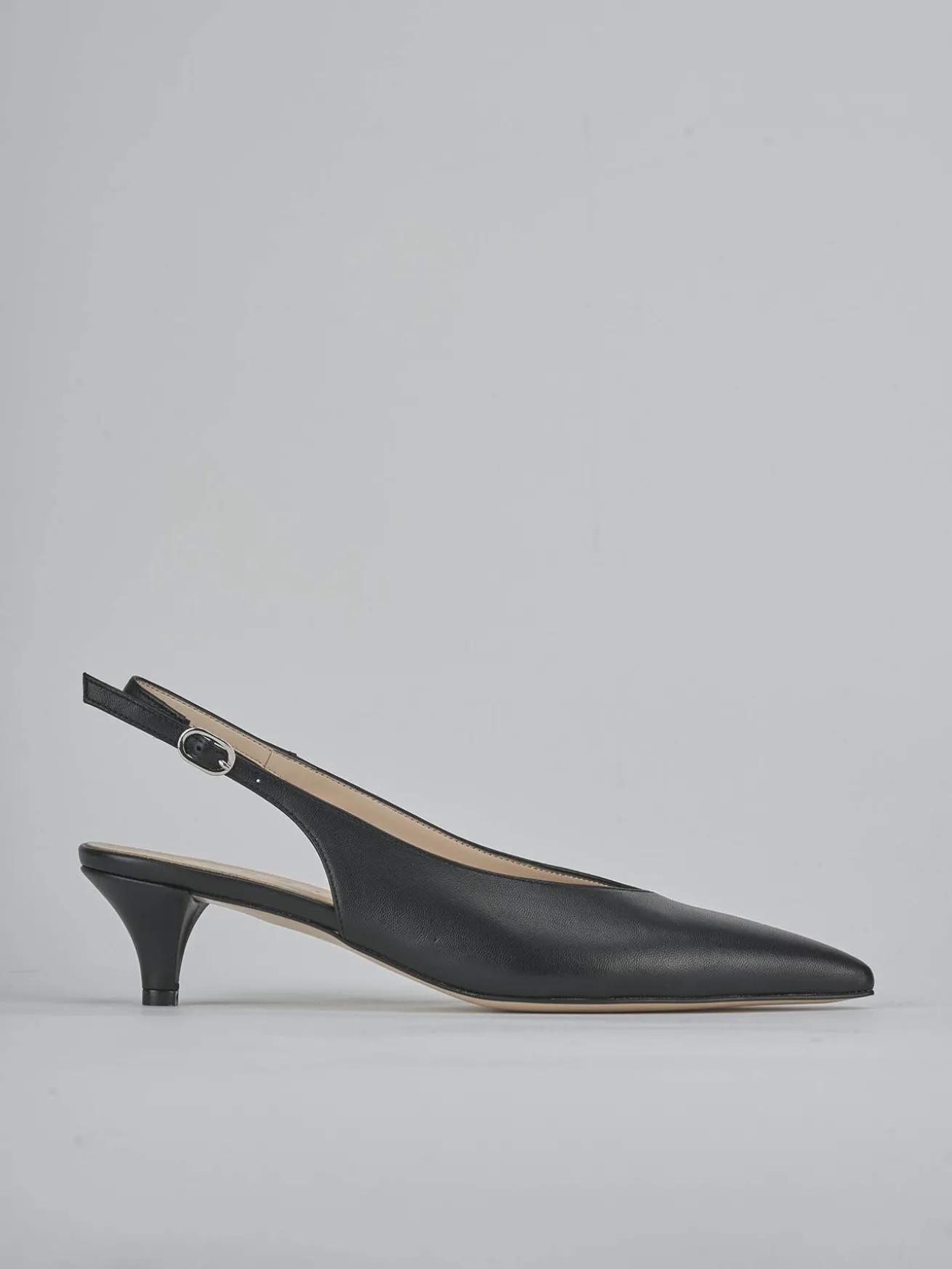 Slingback decolte’ tacco 4.5 cm fondo in cuoio e soletto interno in vera pelle. Tomaia in morbida pelle nappata, punta sfilata, scollo a ‘V’, liscio, cinturino sottile con fibbia regolabile e tacco nuovissimo a cono. Dal design ricercato che dura nel tempo.