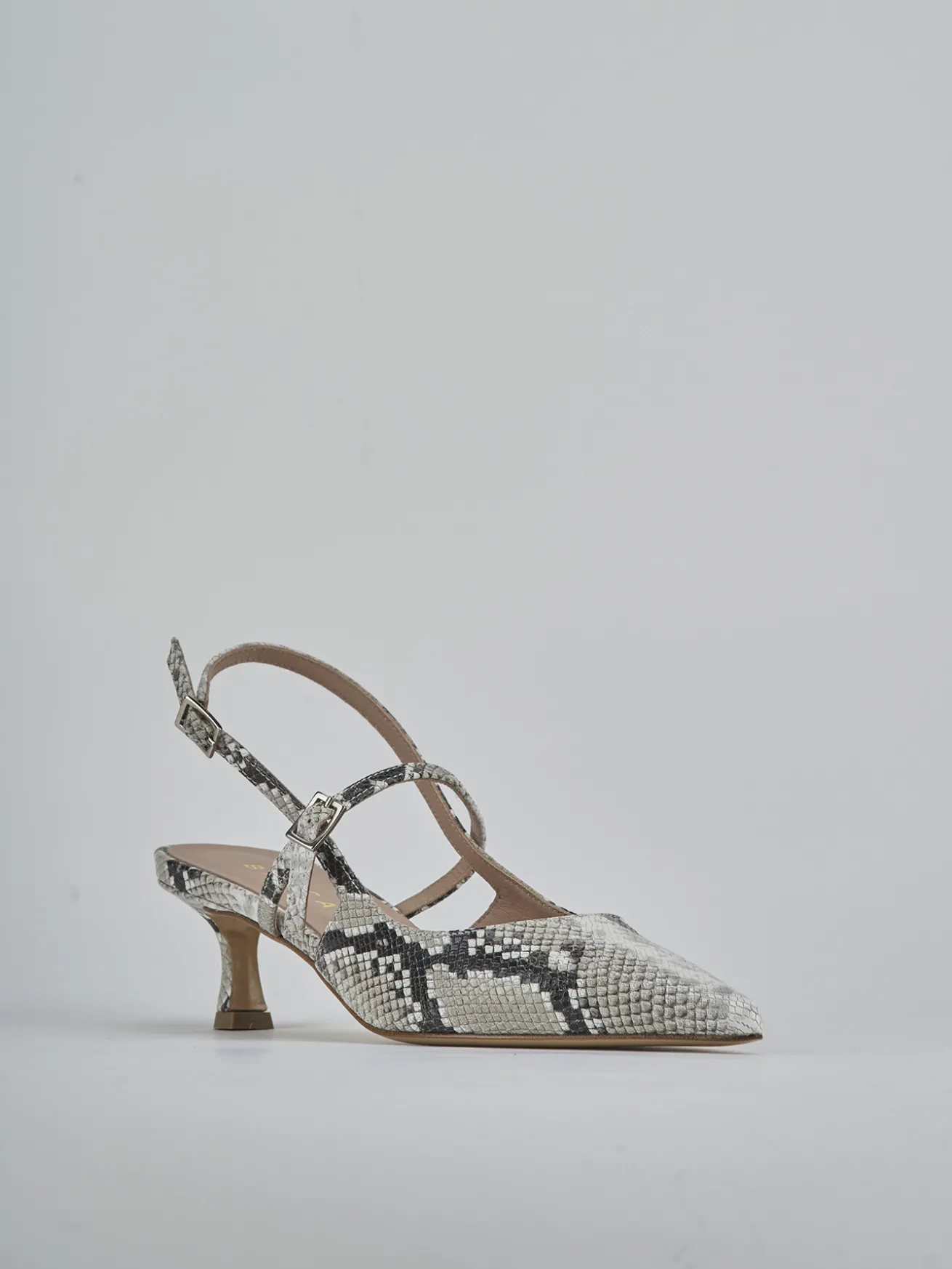 Slingback decolte’ tacco 5 cm fondo in cuoio e soletto interno in vera pelle. Tomaia in morbida pelle stampata effetto pitonato, punta sfilata, scollo a ‘U’, cinturino con fibbia sul collo del piede e cinturino sul tallone con fibbia regolabile e tacco rocchetto per un look cool.