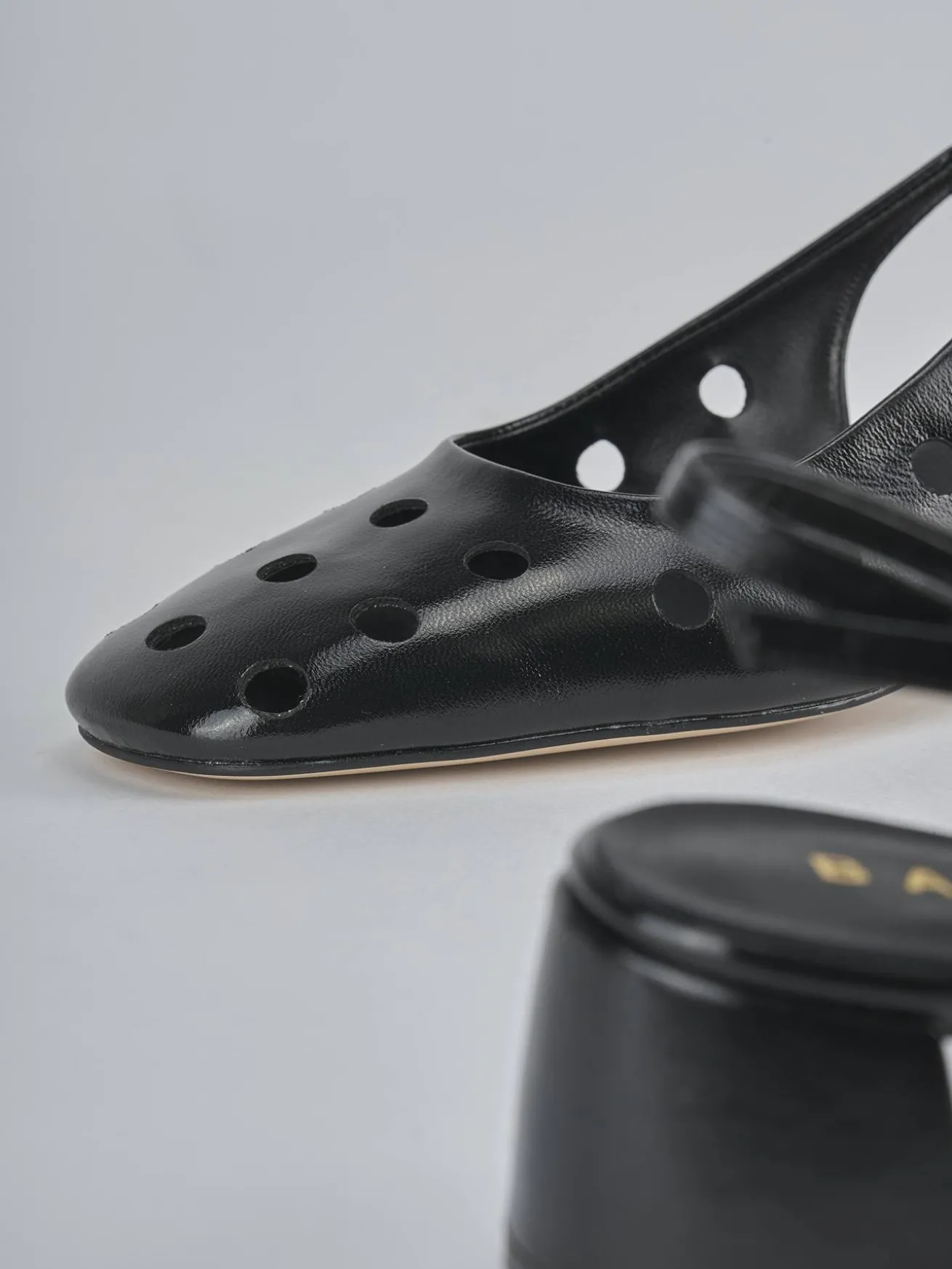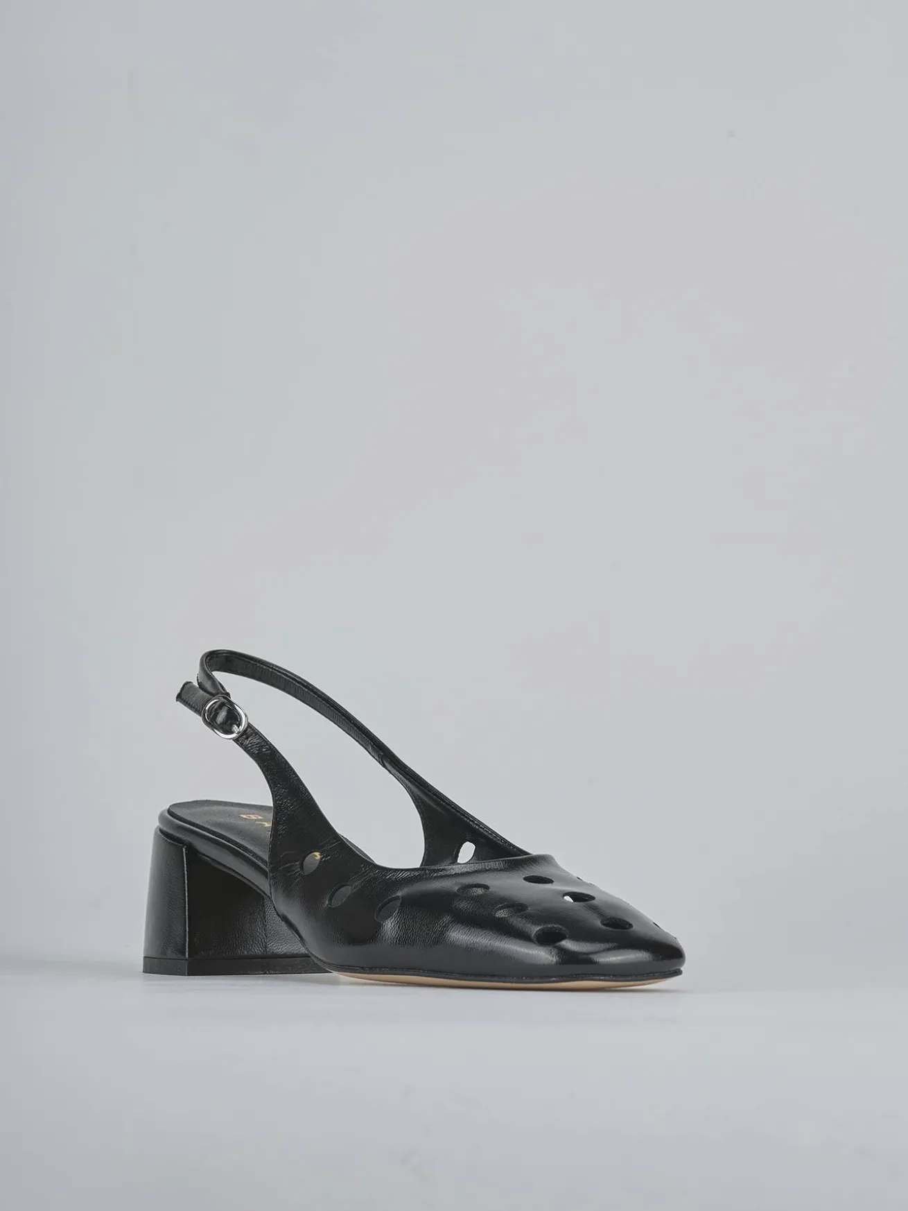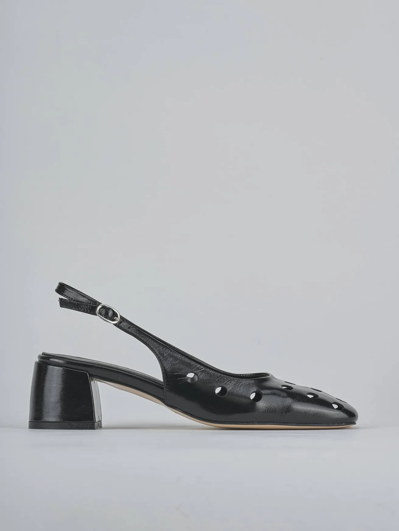 Slingback decolte’ tacco 4.5 cm fondo in leggerissima gomma e soletto interno in vera pelle. Tomaia in morbida pelle effetto verniciato, punta squadrata, scollo a ‘U’, fori a cerchio, cinturino sottile con fibbia regolabile e tacco grosso stabile per un look chic.