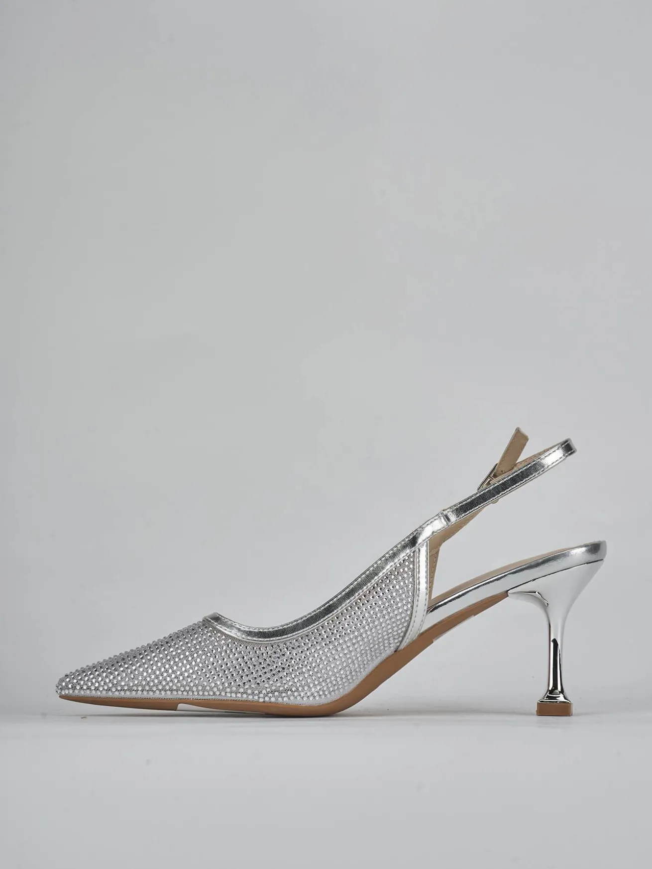 Slingback tacco 6 cm fondo in leggera gomma e soletto interno in vera pelle. Tomaia in morbida pelle foderata in tessuto, punta sfilata, rete semitrasparente, strass, bordo a rinforzo ton sur ton, cinturino con fibbia regolabile e tacco rocchetto. Perfetto per qualsiasi sia la tua occasione.