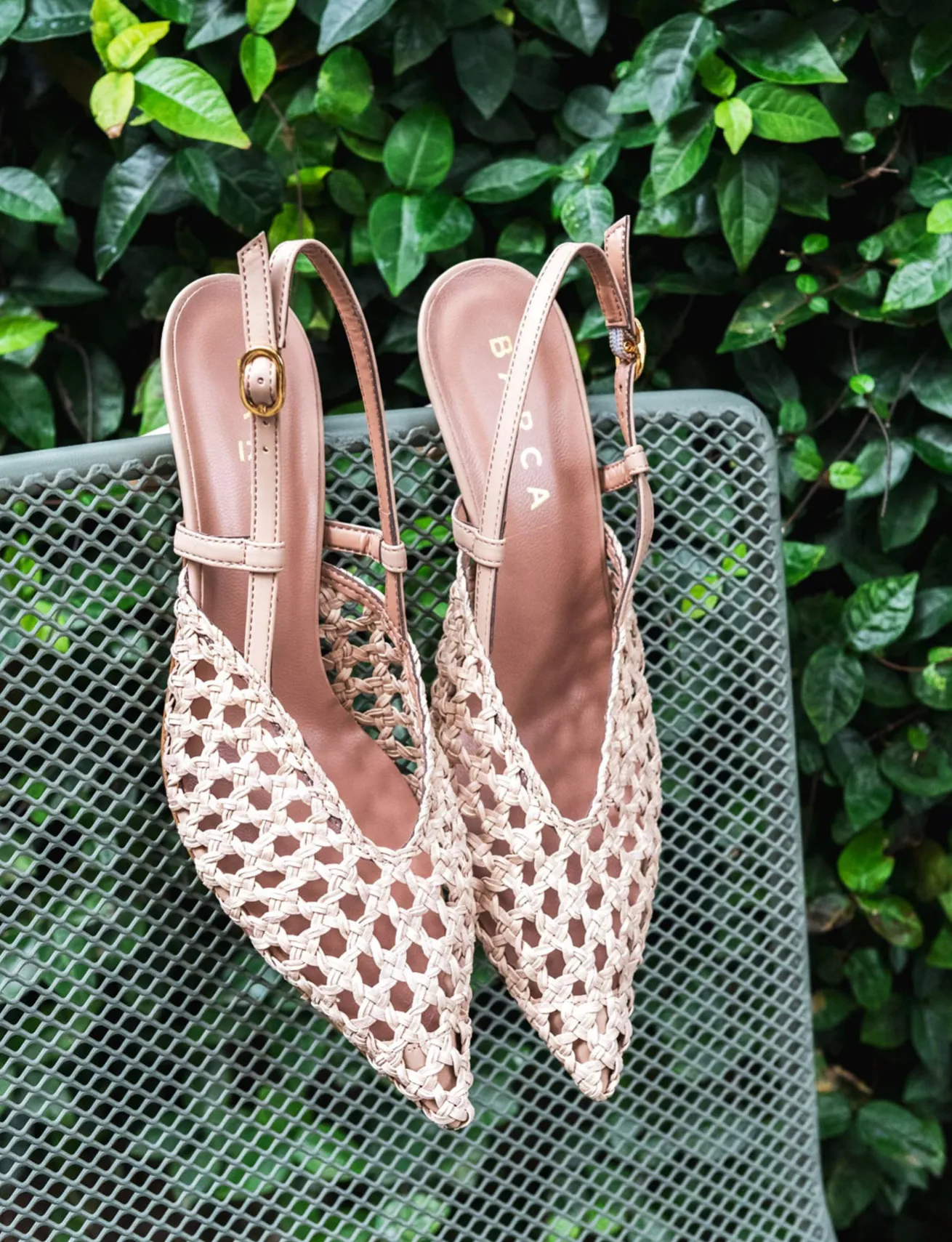 Slingback decolte’ tacco 6.5 cm fondo in cuoio e soletto interno in vera pelle. Tomaia in morbida pelle intrecciata artigianalmente, punta sfilata, scollo profondo e stretto a ‘U’, cinturino con fibbia regolabile e tacco rocchetto per maggiore stabilità. Perfetto con un jeans o un vestito.
