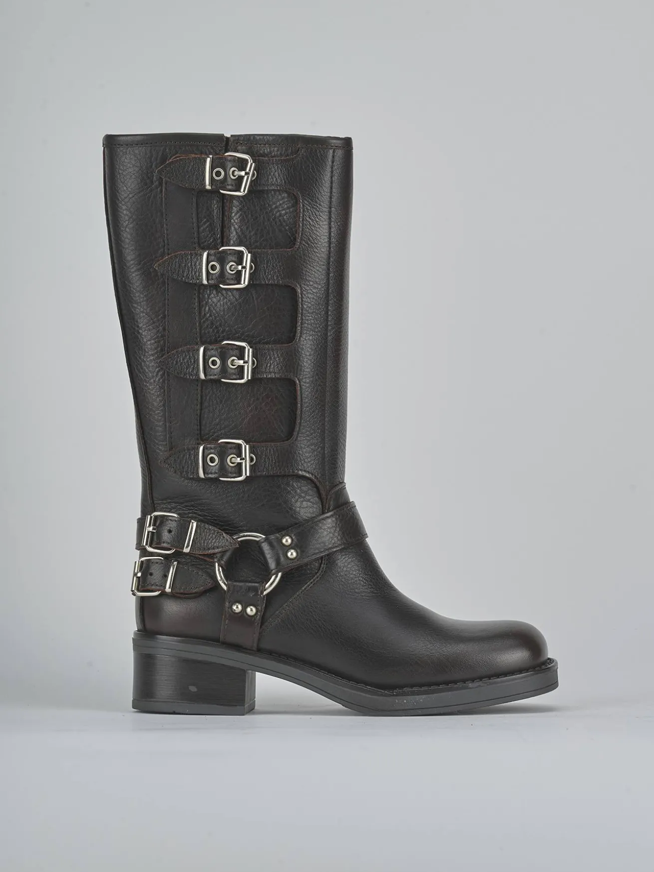 Il gambale si estende appena sotto il ginocchio, perfetto per essere abbinato a un vestito o una gonna in stile biker.