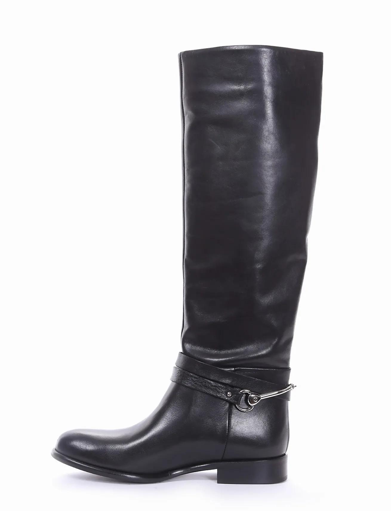 stivale tacco 2 cm, fondo in gomma e soletto interno in vera pelle. Tomaia in morbidissima pelle nappata, punta arrotondata e gambale a tubo altezza 35 cm, con particolarissimo morsetto in acciaio.