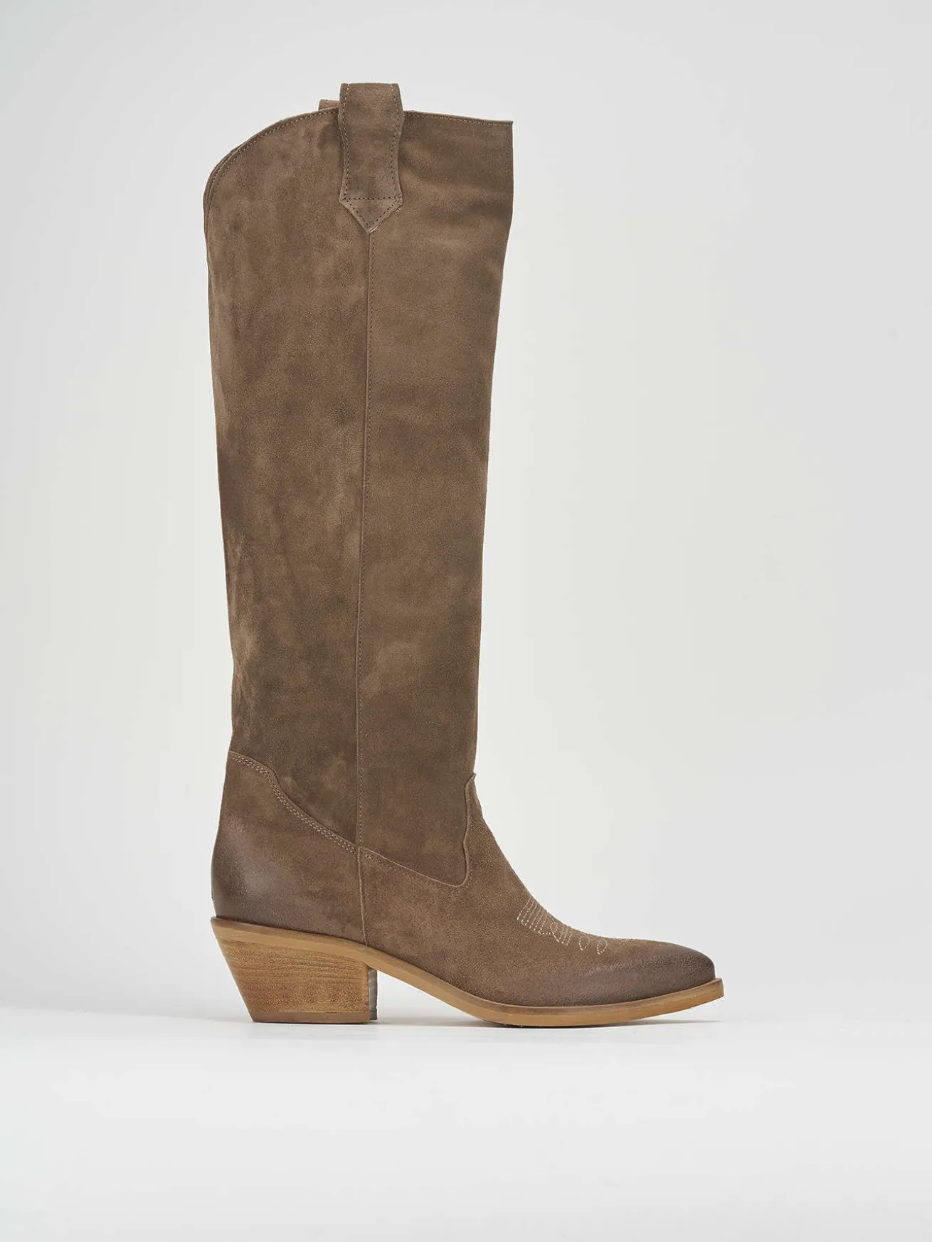 stivale texano tacco 4 cm, fondo gomma e soletto interno in vera pelle. tomaia in morbida pelle scamosciata, texano, ghette per un look cool. Altezza gambale fino a sotto il ginocchio.