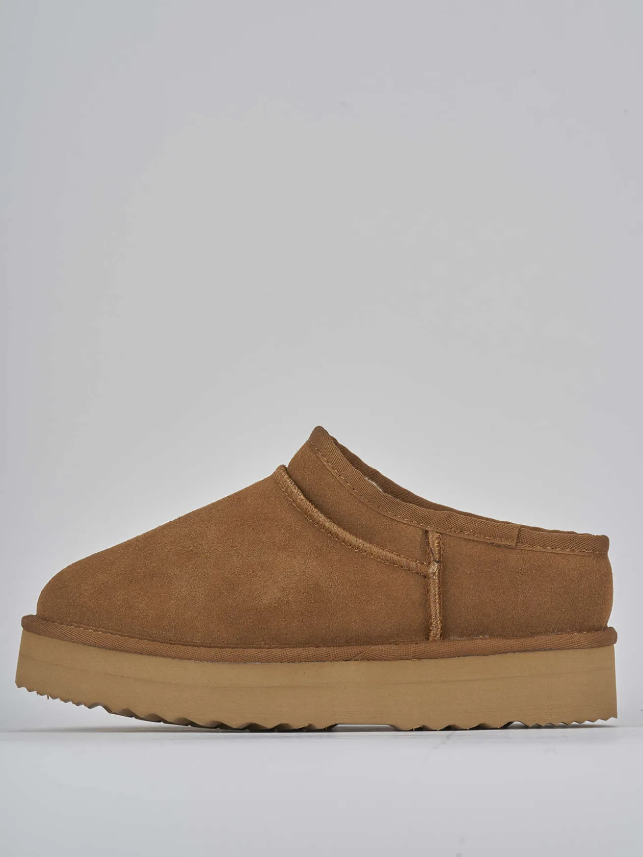 Stivaletto sabot fondo in gomma e soletto interno in pelo. Tomaia in morbido camoscio, punta tonda, cuciture visibili e piccolo platform di 2 cm per un look casual cool perfetto. adatto con un paio di jeans vintage e un cappotto lungo.