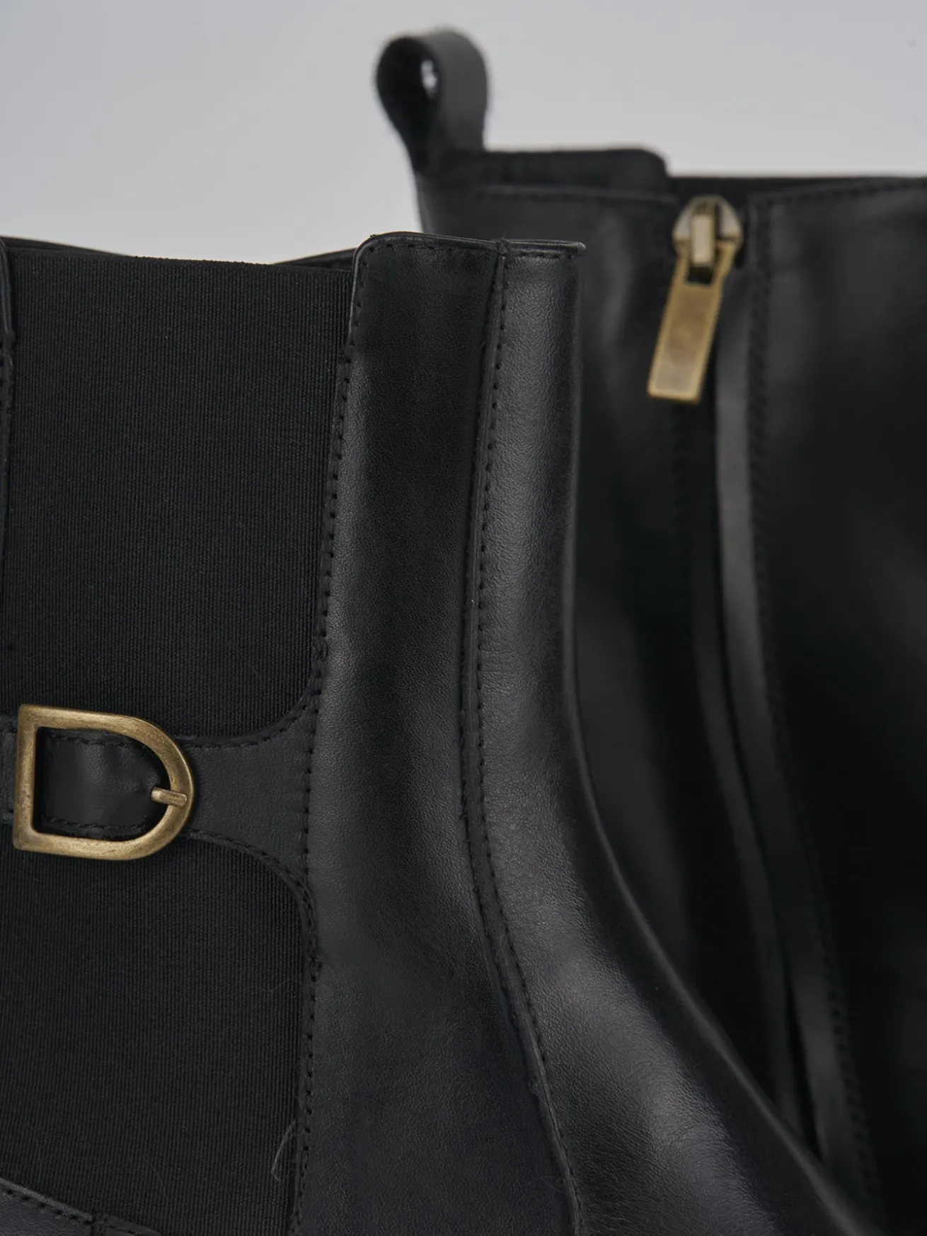 Stivaletto tacco 2 cm fondo in gomma e soletto interno in vera pelle. Tomaia in morbida pelle, punta affusolata, cerniera laterale, tessuto elasticizzato con fibbia per un look cool.