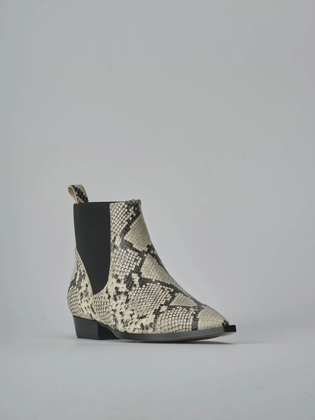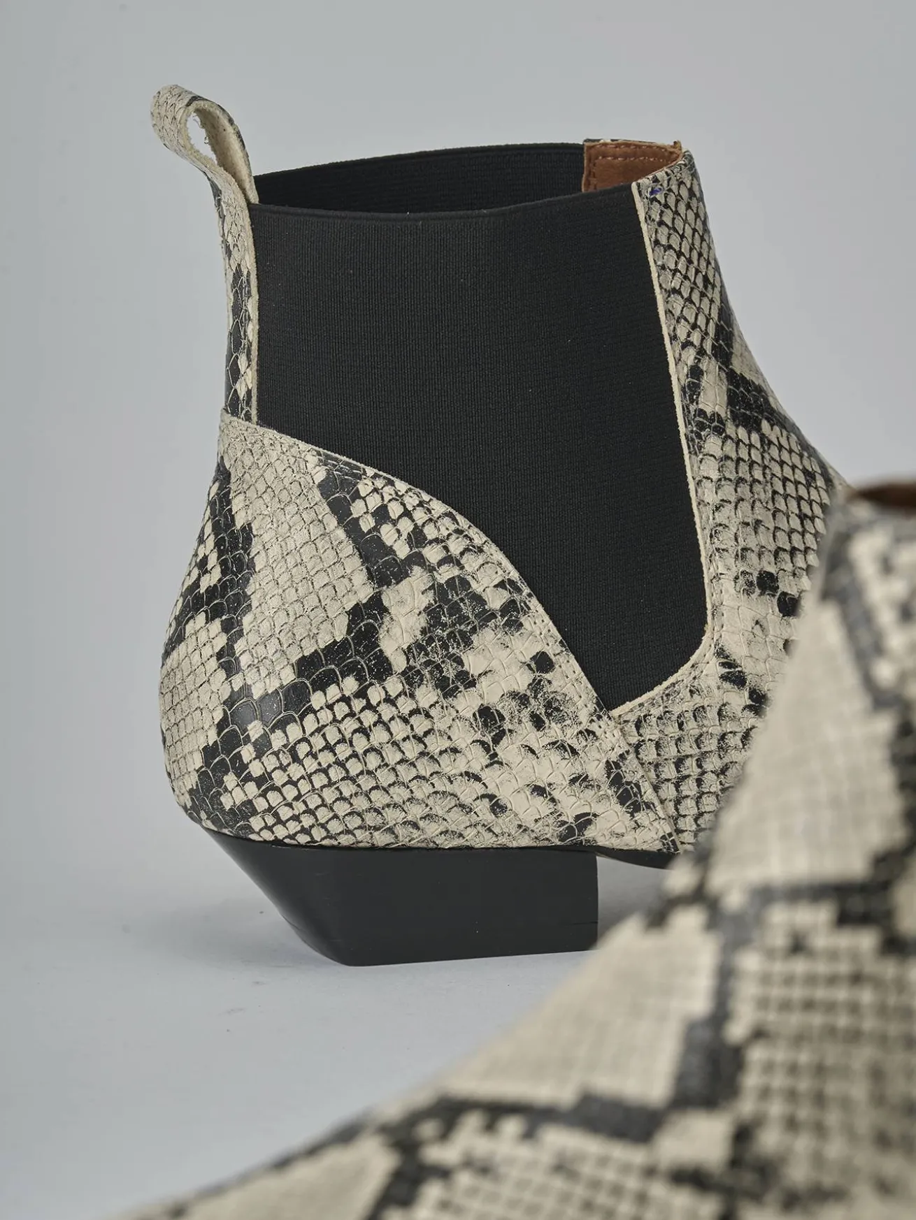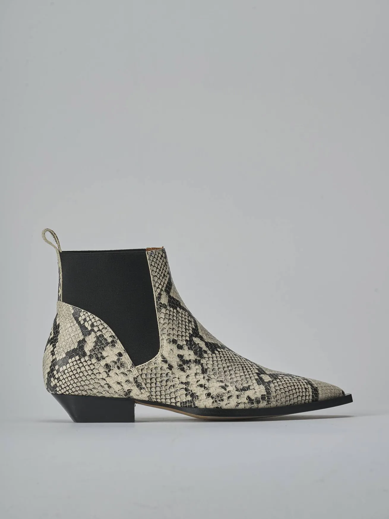 La tomaia è realizzata in morbida pelle stampata effetto pitonato, con una punta sfilata che aggiunge un tocco di eleganza.