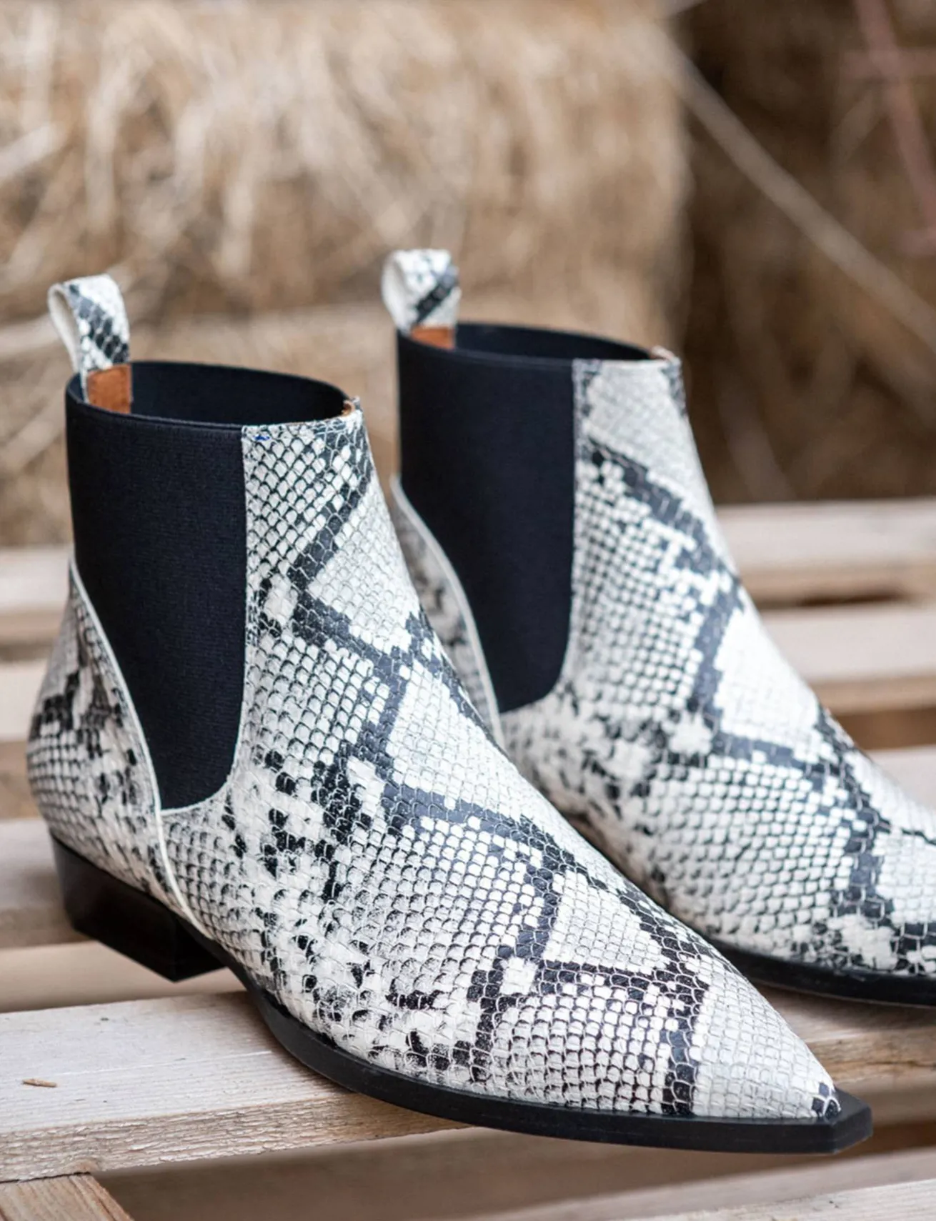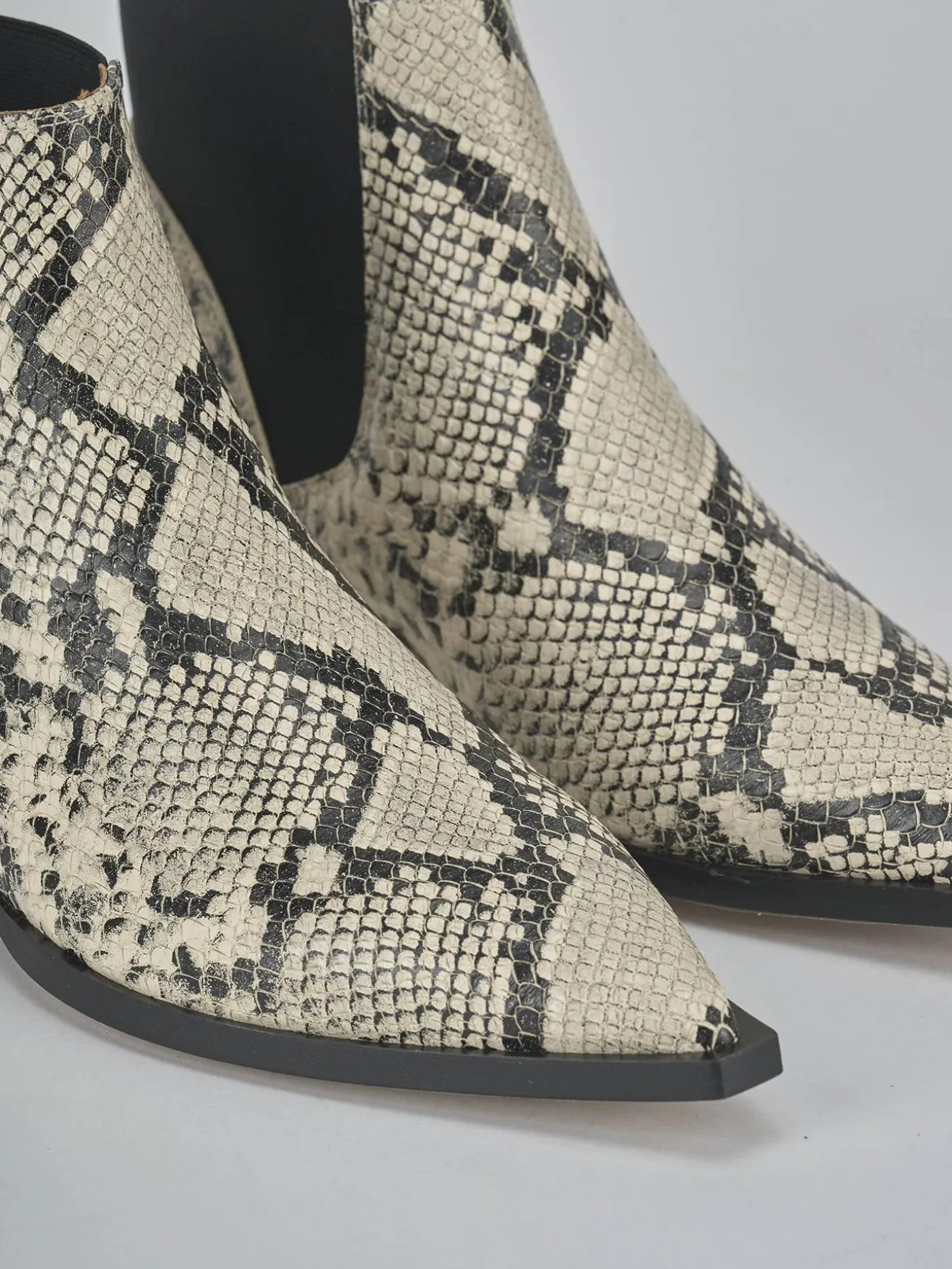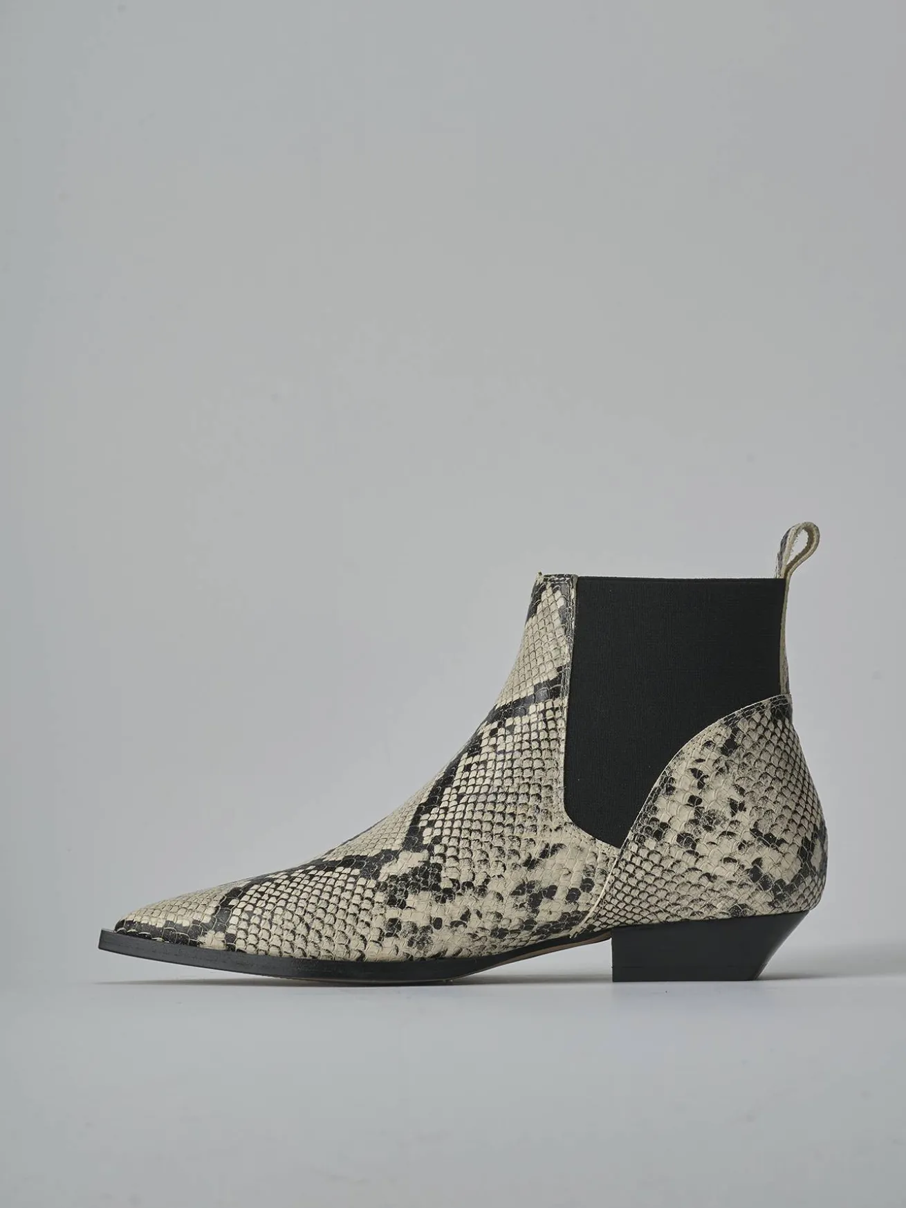 La tomaia è realizzata in morbida pelle stampata effetto pitonato, con una punta sfilata che aggiunge un tocco di eleganza.