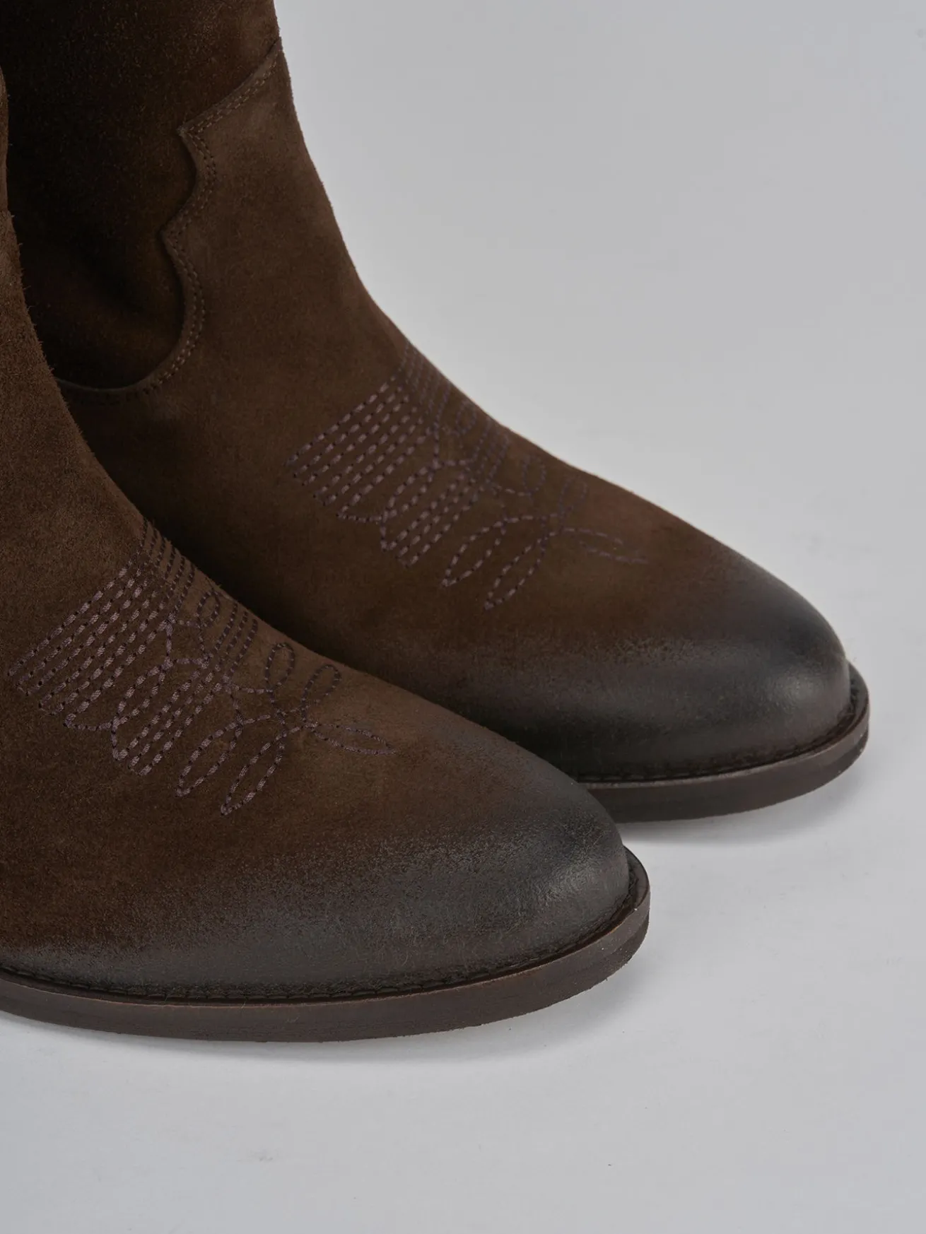 Stivaletto texano tacco 3 cm fondo in gomma e soletto interno in vera pelle. Tomaia in morbido camoscio, punta sfilata, ricami sul collo del piede, cuciture visibili, apertura svasata, ghette e tacco solido per un look texan cool.