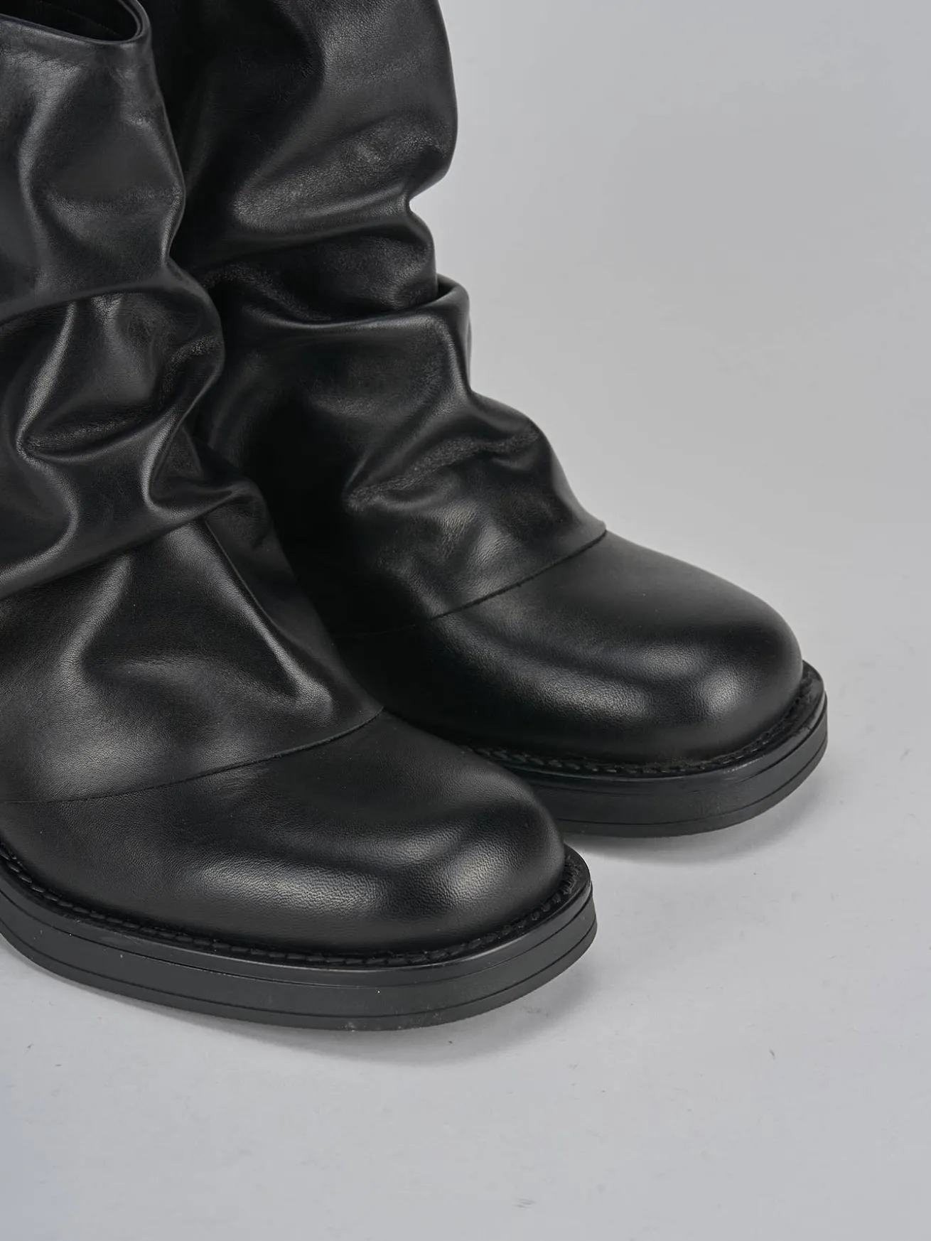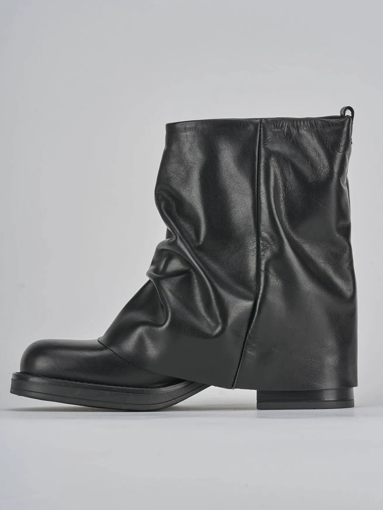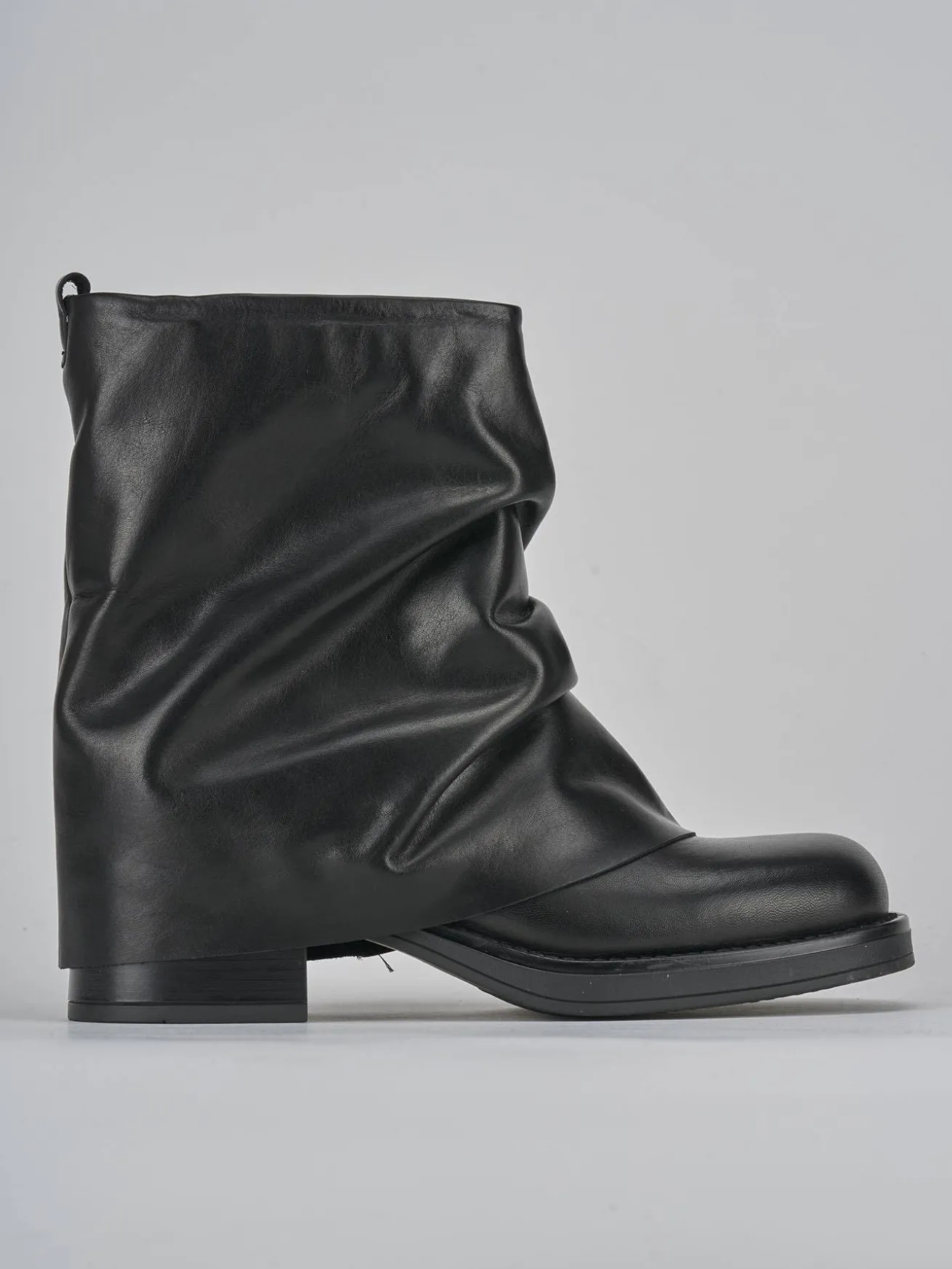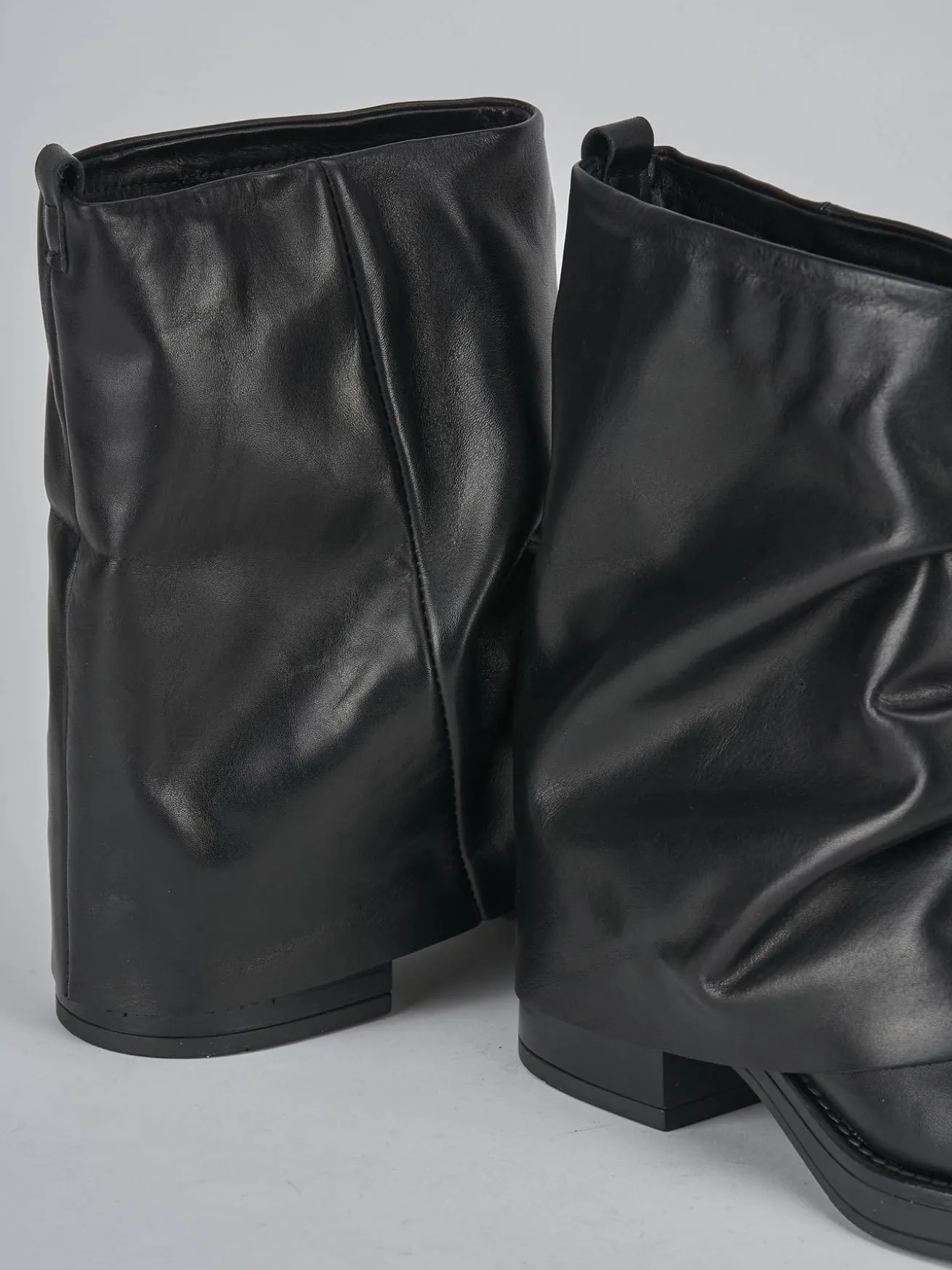 Realizzati in morbida pelle nera, questi stivaletti da donna presentano un moderno design con punta squadrata e un affascinante gambale arricciato.