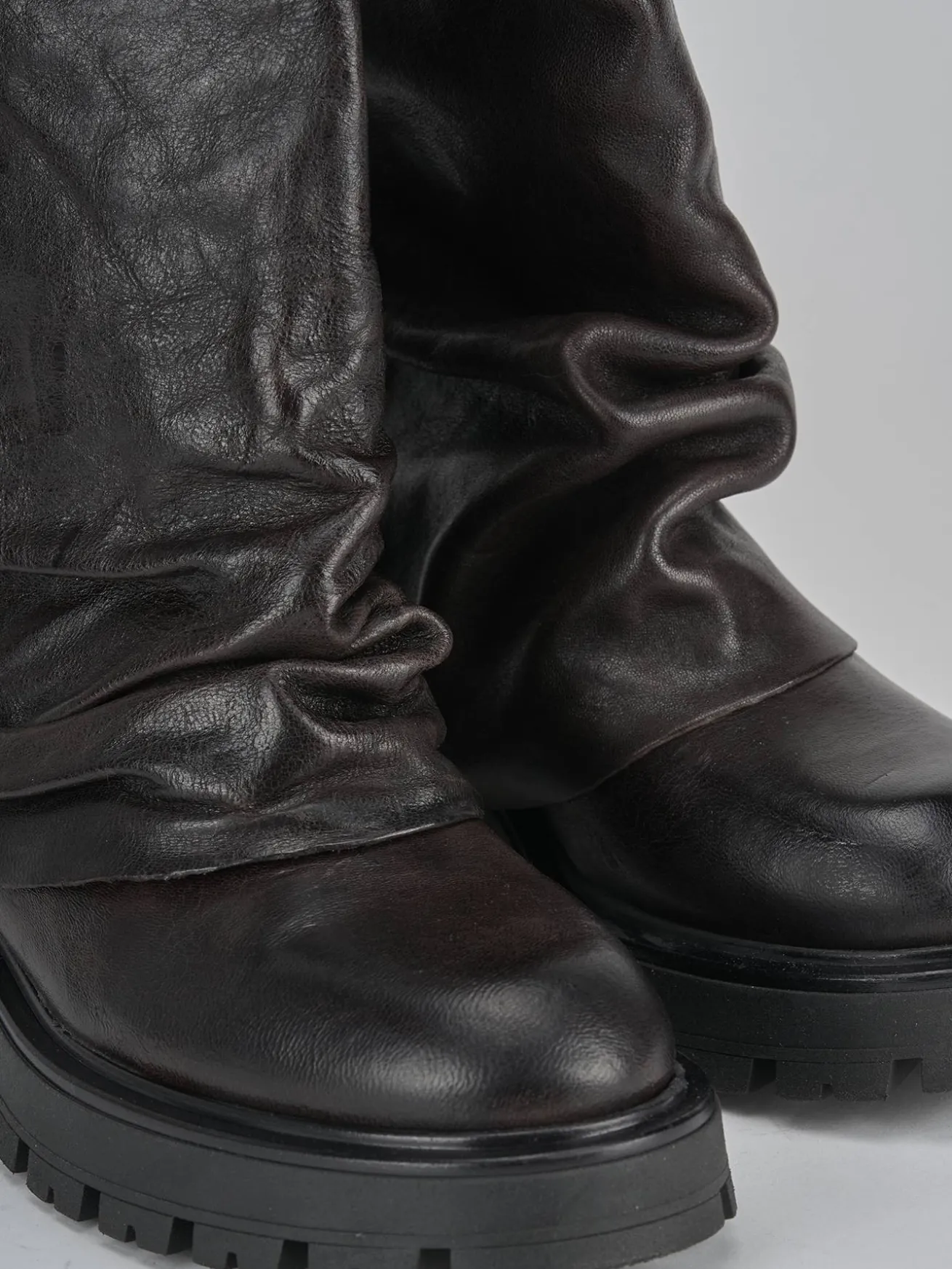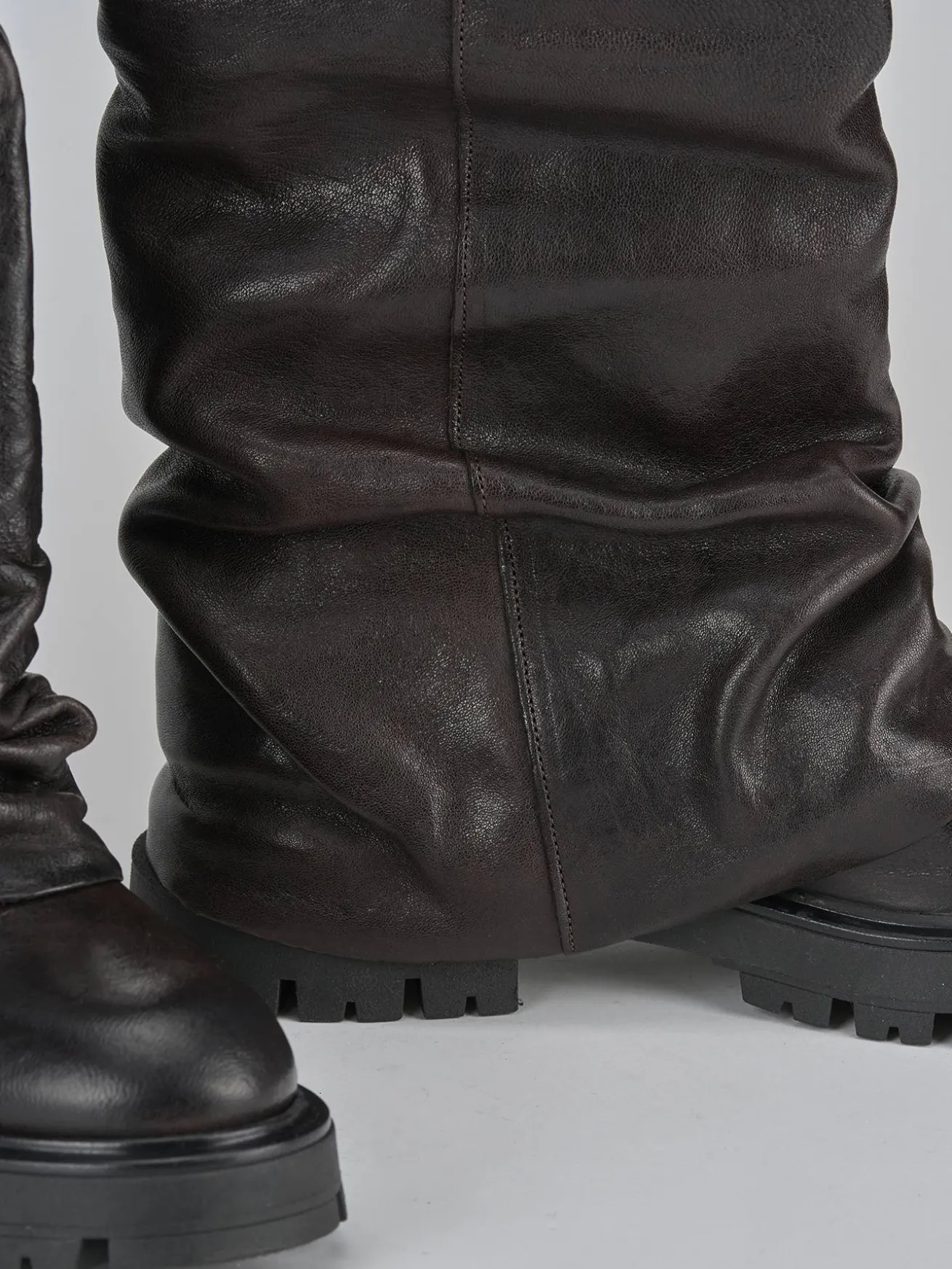 Il gambale arricciato che arriva a metà polpaccio dona un aspetto moderno e dinamico, perfetto per un look biker chic.