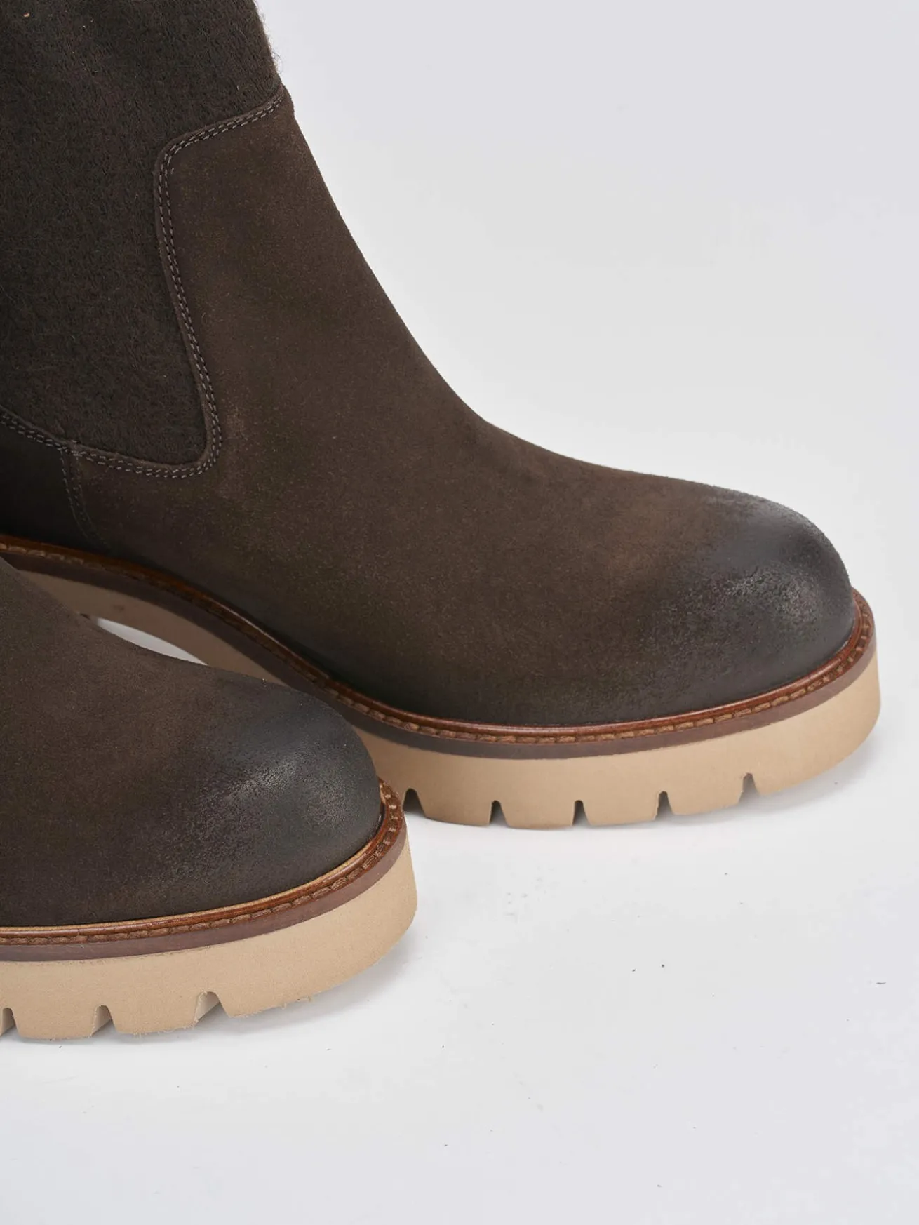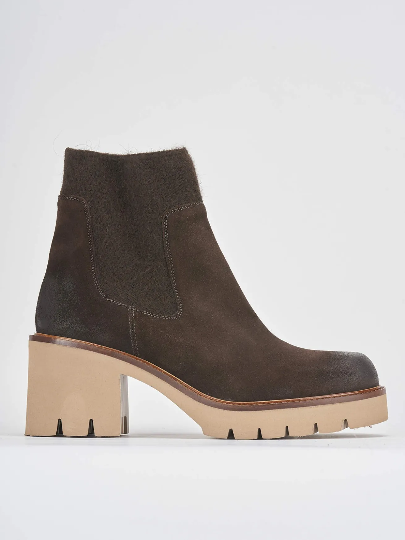 Tronchetto tacco 5 cm fondo in gomma e soletto interno in vera pelle. Tomaia in morbido camoscio, punta tonda, plateau di 1 cm sulla parte anteriore, cuciture visibili e lati elasticizzati con tessuto in lana e tacco grosso in contrasto con la tomaia per un look cool.