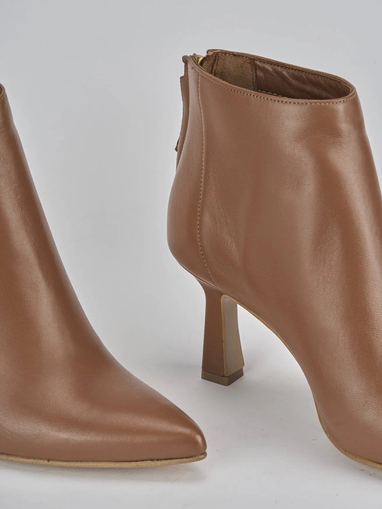 Stivaletto tacco 5 cm fondo in cuoio e soletto interno in vera pelle. Tomaia in morbida pelle, punta sfilata, cuciture visibili e comoda cerniera posteriore. Nuovissimo tacco rocchetto. Per dare un tocco chic ai tuoi look.