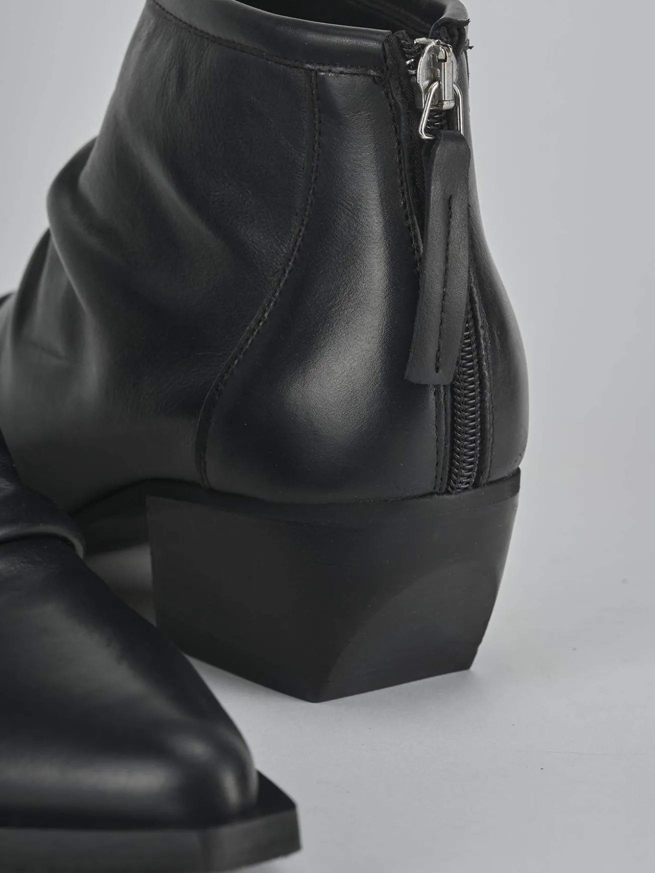 Stivaletto texano tacco 5 cm fondo in gomma e soletto interno in vera pelle. Tomaia in morbida pelle, punta sfilata, cuciture a mano, arricciata sul davanti, comoda cerniera posteriore e tacco stabile. Perfetto con un paio di jeans e una maglia.