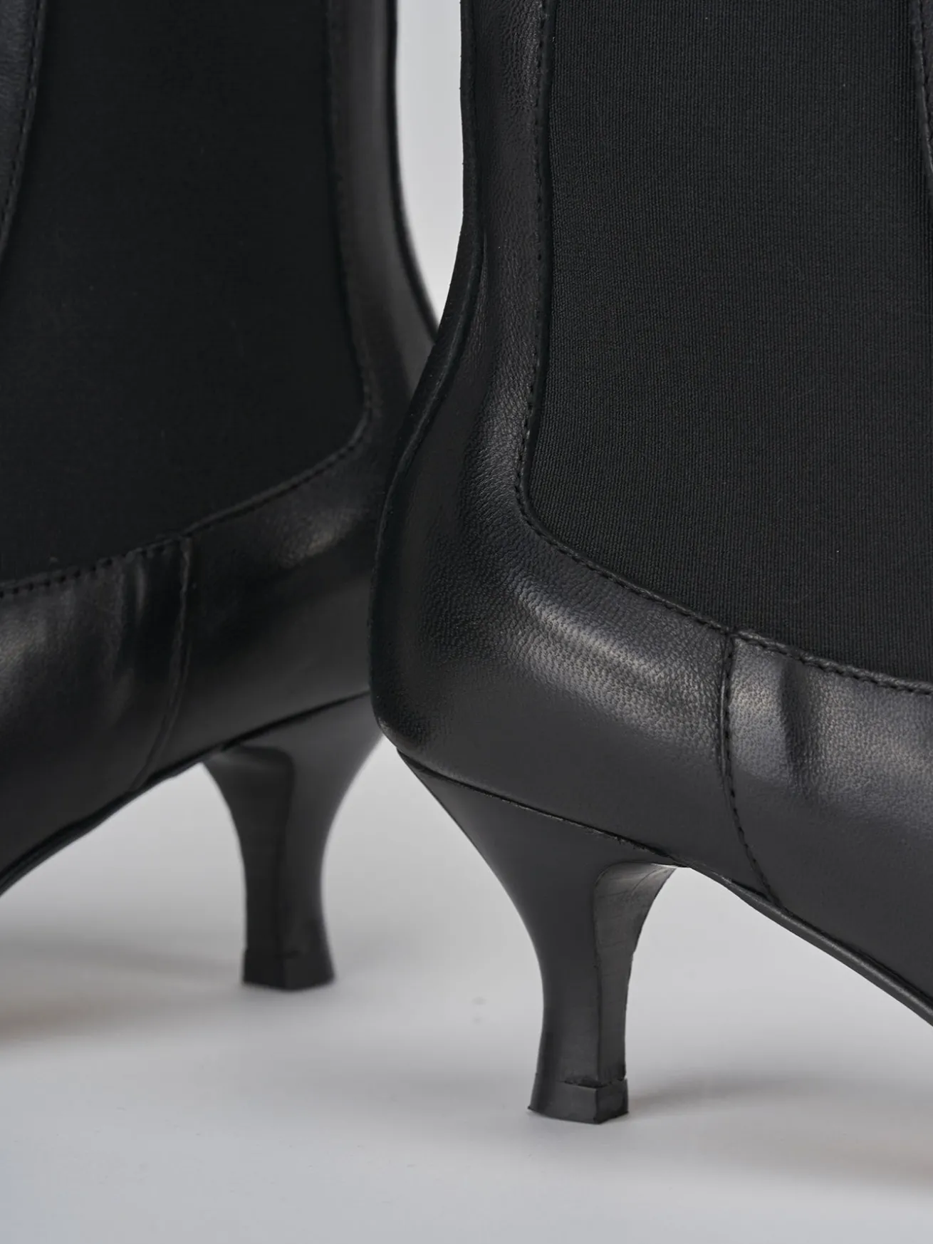Stivaletto tacco 5 cm fondo in gomma e soletto interno in vera pelle. Tomaia in morbida pelle, punta sfilata, tessuto elasticizzato ai lati e tacco rocchetto per un look chic e raffinato.