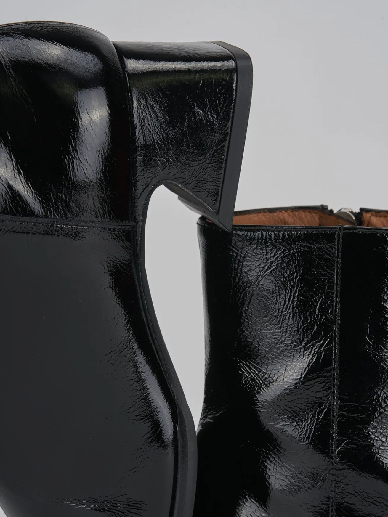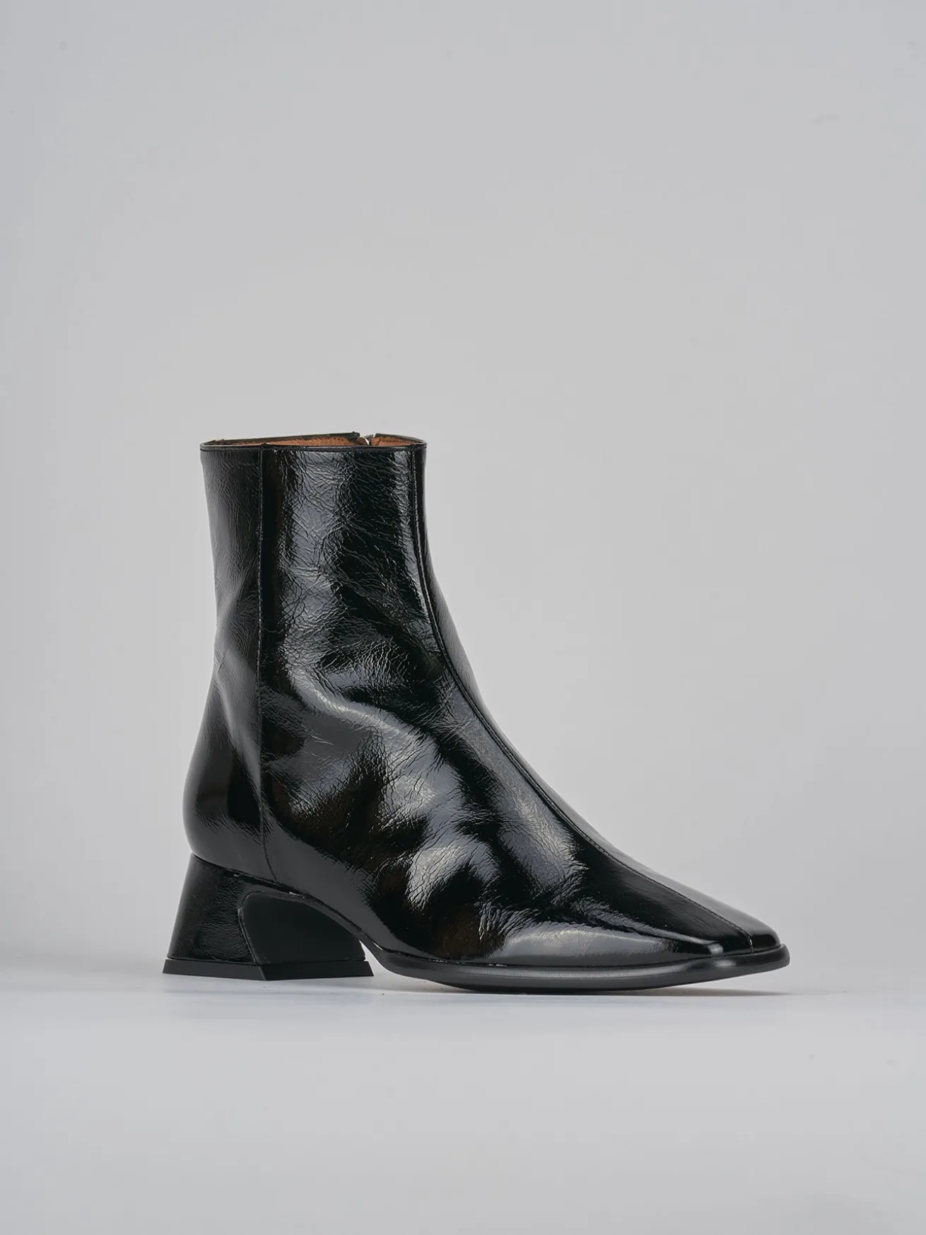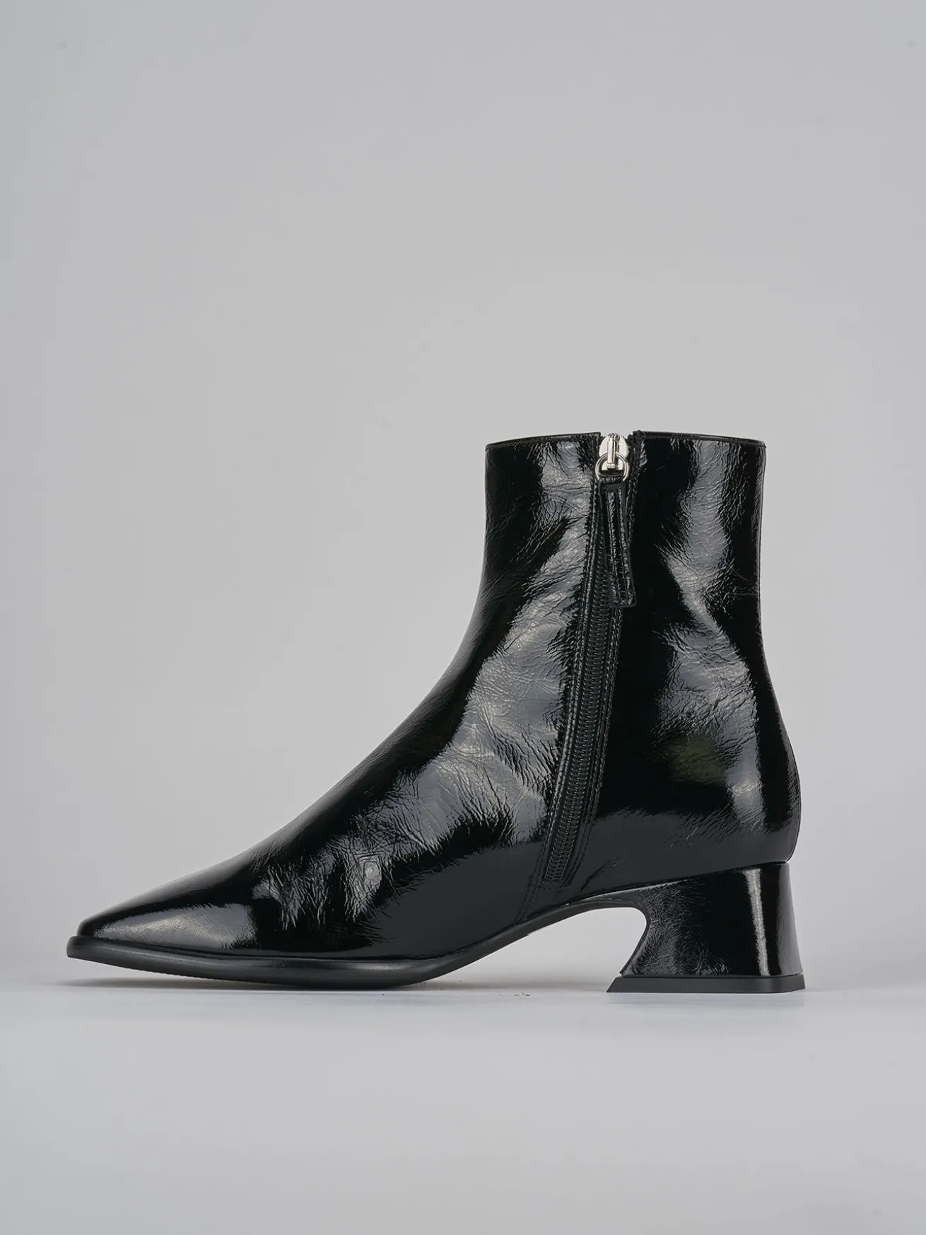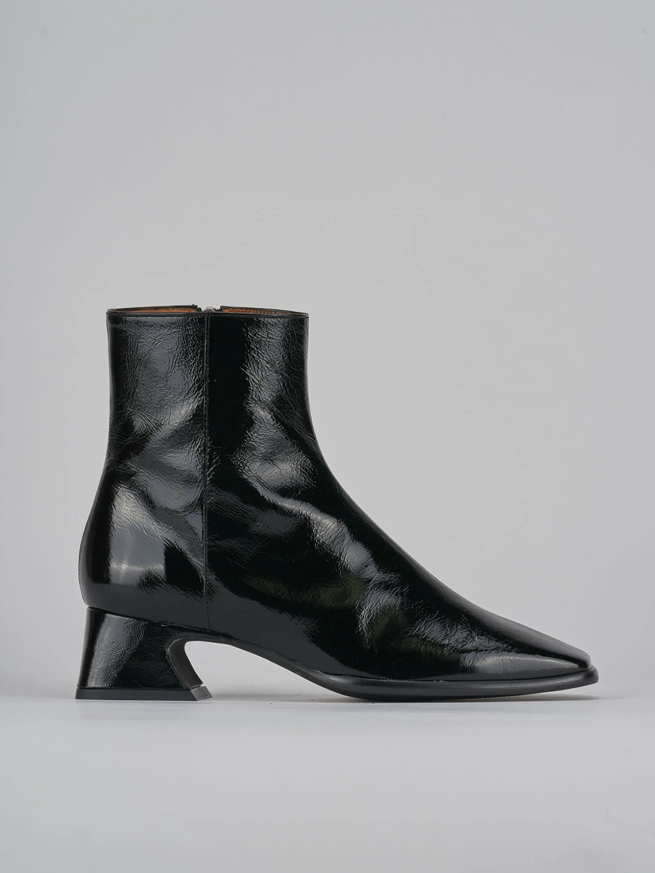 Stivaletto tacco 3 cm fondo in gomma e soletto interno in vera pelle. tomaia in morbida pelle effetto verniciato, punta leggermente squadrata, cerniera laterale, guardolo sporgente e nuovissimo tacco comodo. perfetto con un pantalone a palazzo o una gonna.