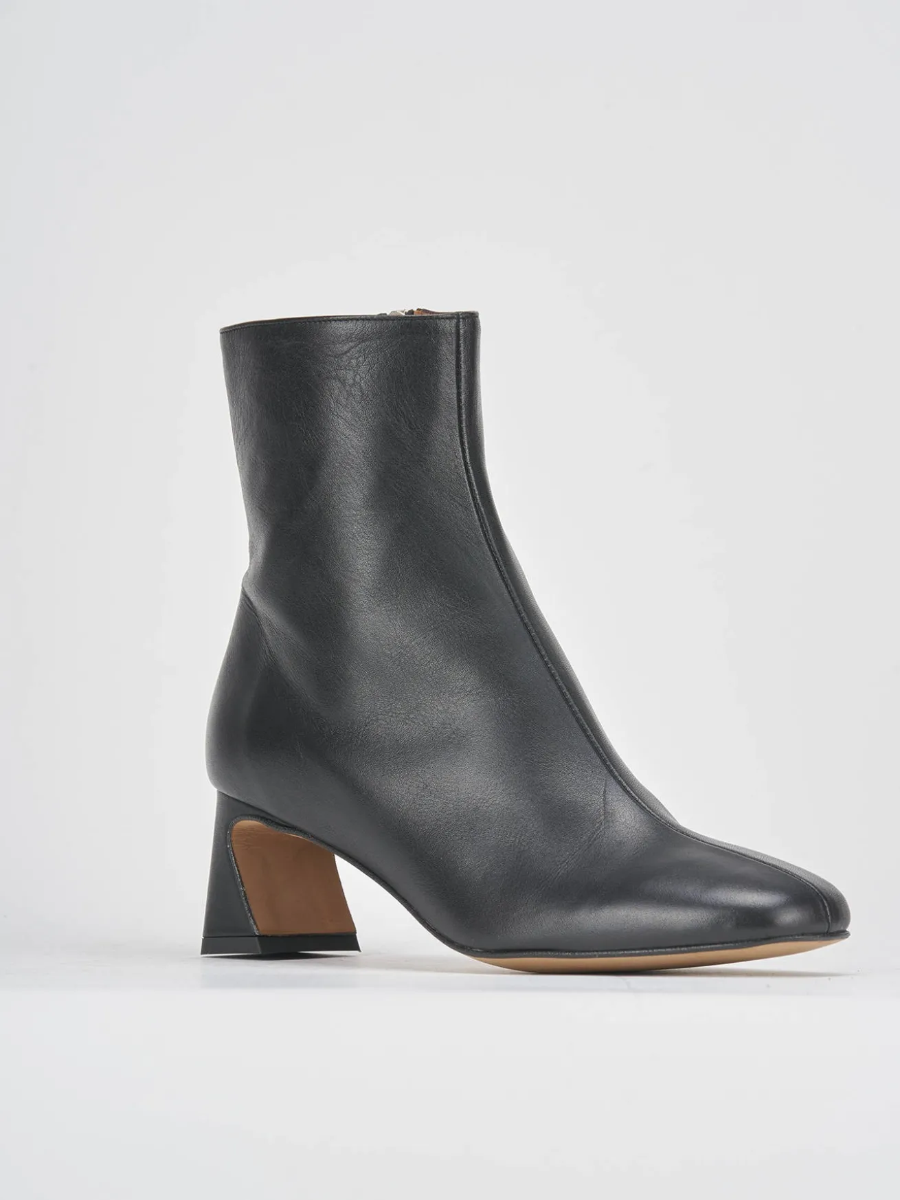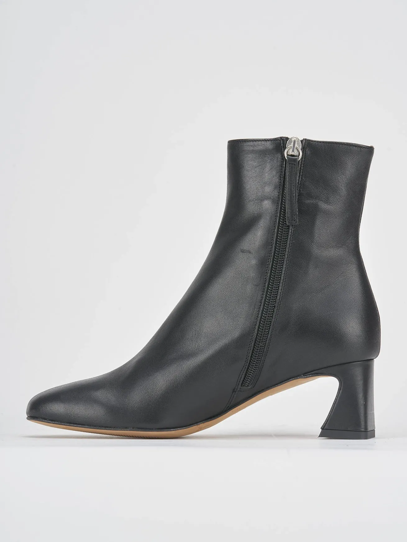 tronchetto tacco 4 cm fondo in leggerissima gomma e soletto interno in vera pelle. tomaia in morbida pelle, punta affusolata, cuciture visbili a metà tomaia. comoda cerniera laterale e nuovissimo tacco rocchetto per un look cool.