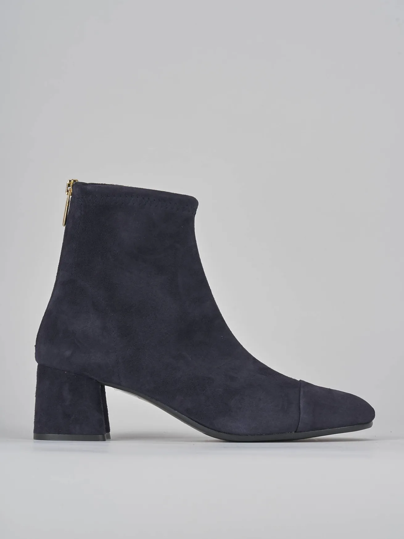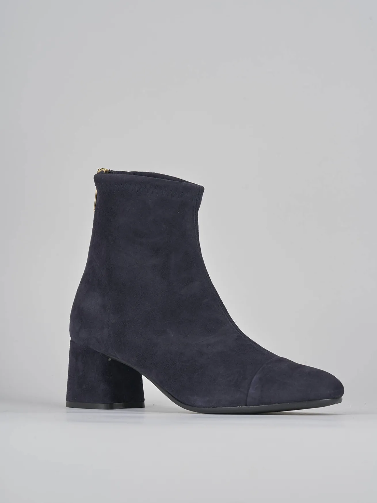 Stivaletto tacco 5.5 cm fondo in gomma e soletto interno in vera pelle. tomaia in morbido camoscio ed elasticizzato solo in caviglia, puntale ton sur ton, comoda cerniera posteriore e tacco grosso per un look che non passa mai di moda.