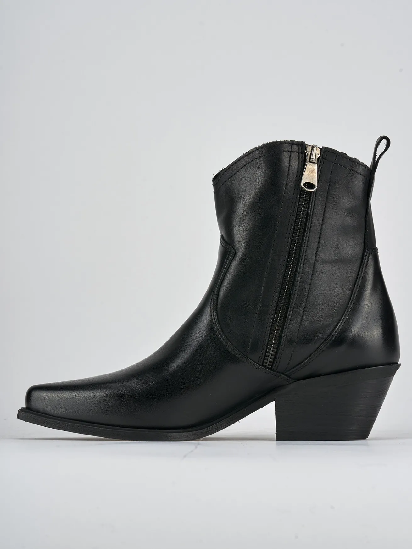 Stivaletto texano tacco 6 cm fondo in leggera gomma e soletto interno in vera pelle. tomaia in morbida pelle, punta sfilata, cuciture in rilievo, ghette e tacco cubano. Particolare guardolo sporgente per un look tex perfetto.