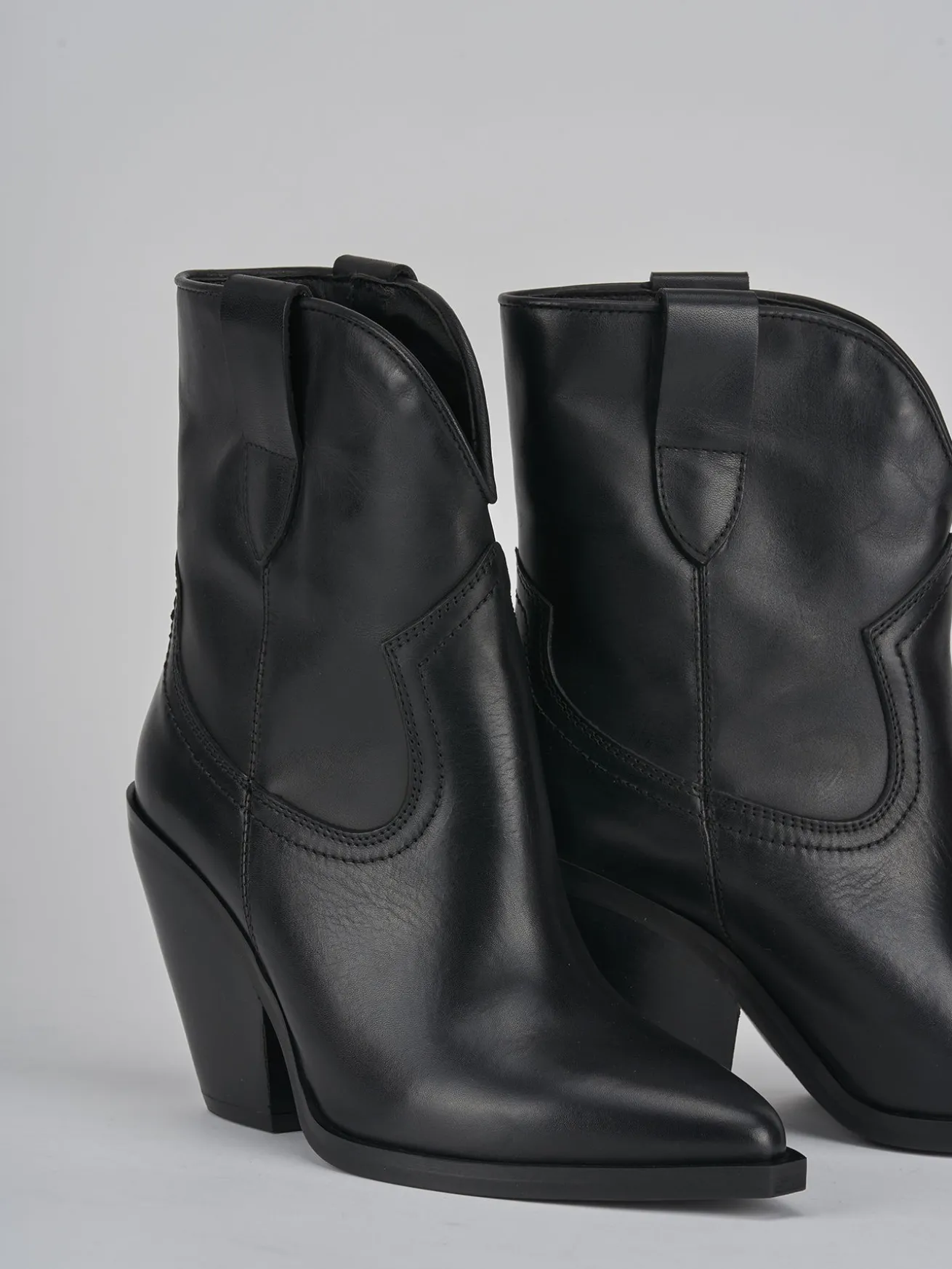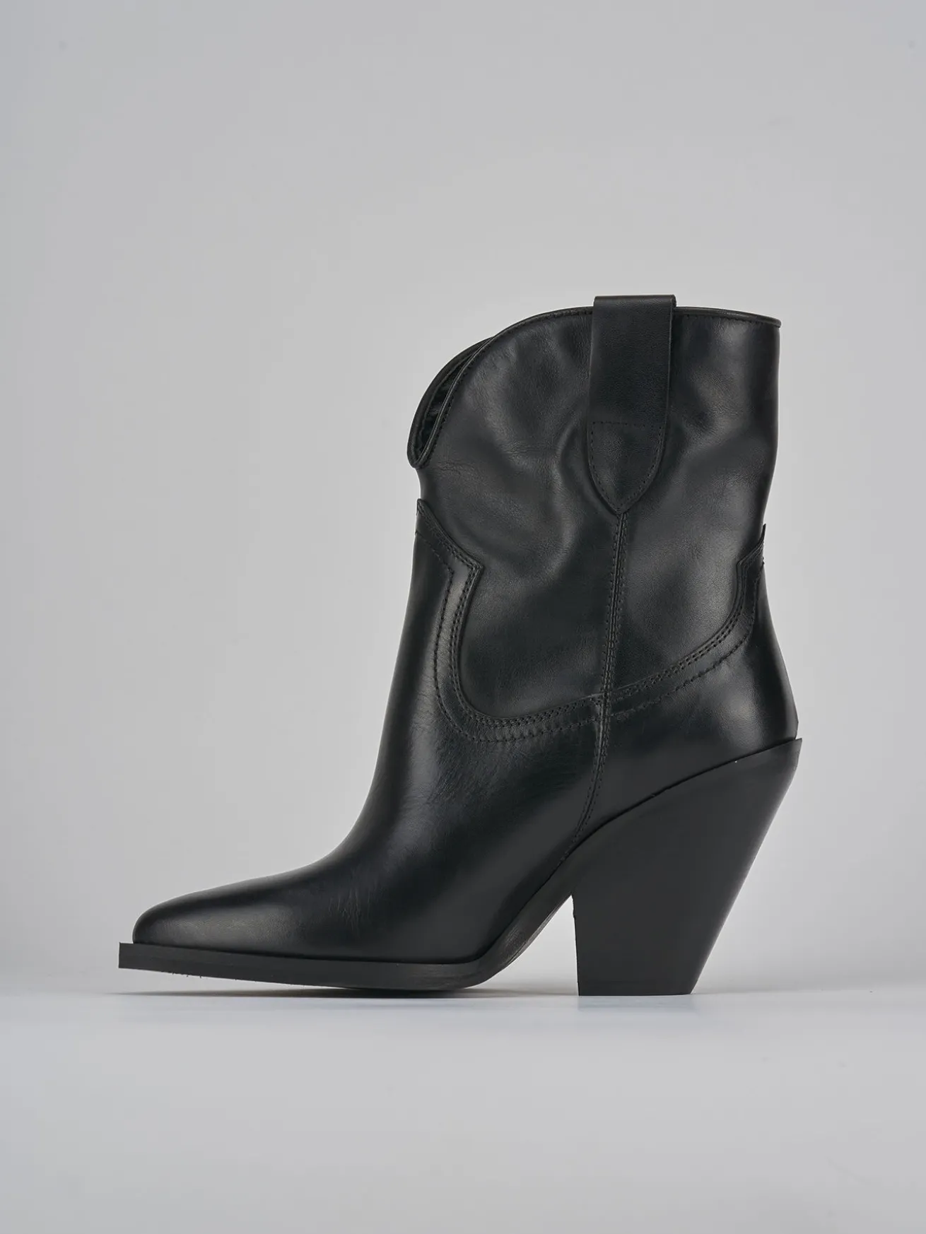 Stivaletto texano tacco 6 cm fondo in gomma e soletto interno in vera pelle. Tomaia in morbida pelle, punta sfilata, cuciture visibili, apertura svasata frontale, ghette, guardolo a filo e tacco cubano dalle linee slanciate per un perfetto look texano.
