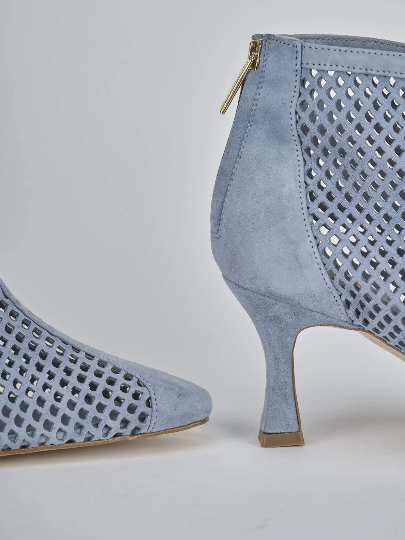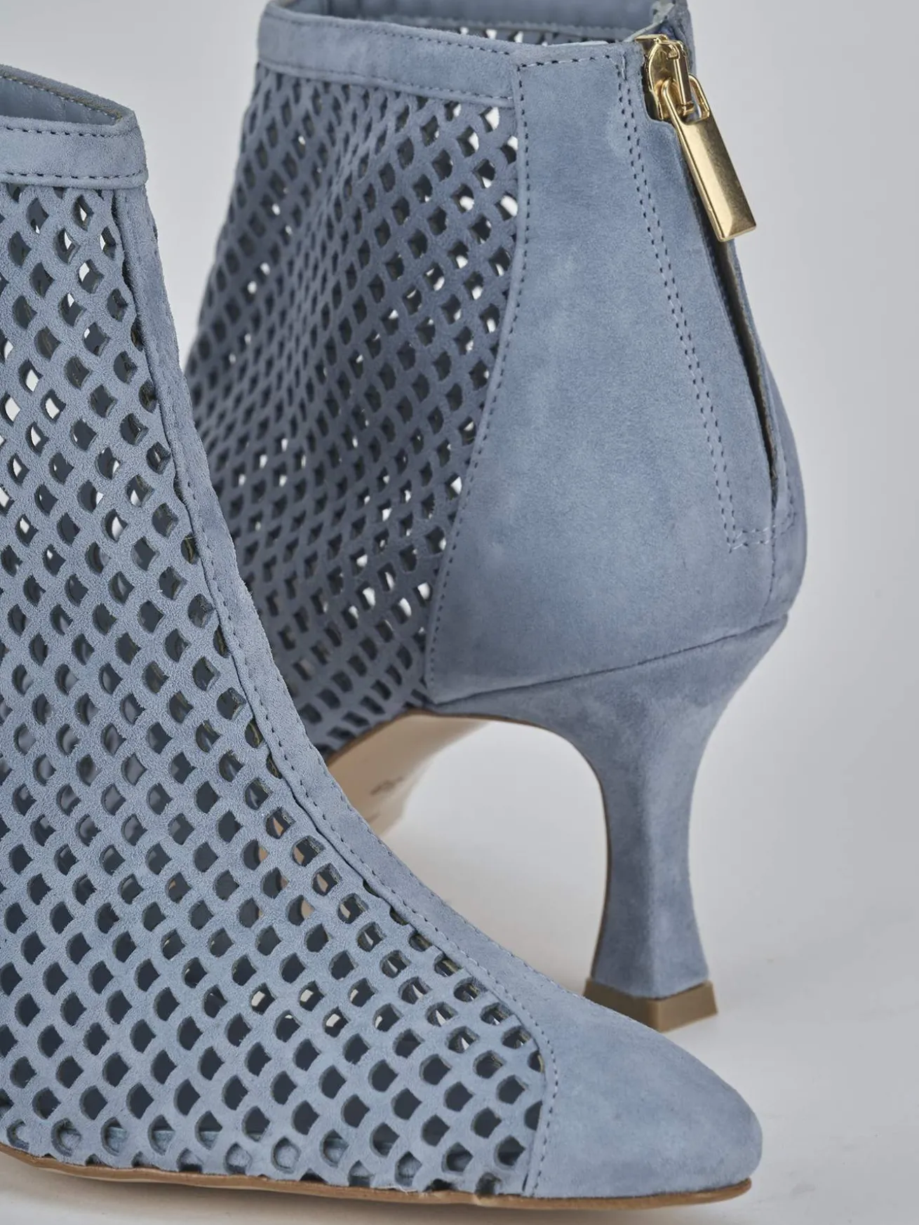 Stivaletto tacco 7 cm fondo in leggera gomma e soletto interno in vera pelle. Tomaia in morbida camoscio forato, punta sfilata, puntale ton sur ton, liscio, comoda cerniera posteriore e tacco rocchetto per un look chic.