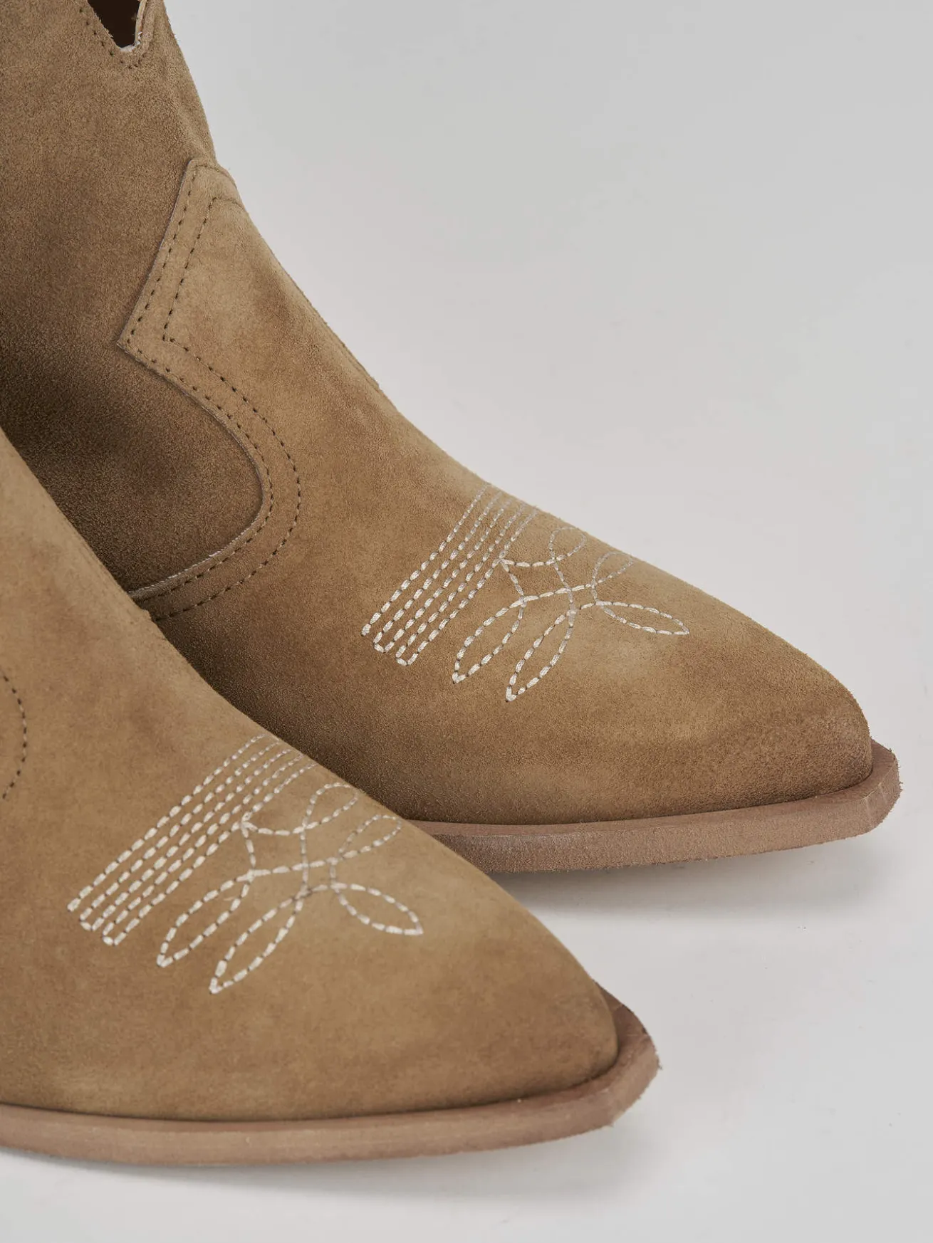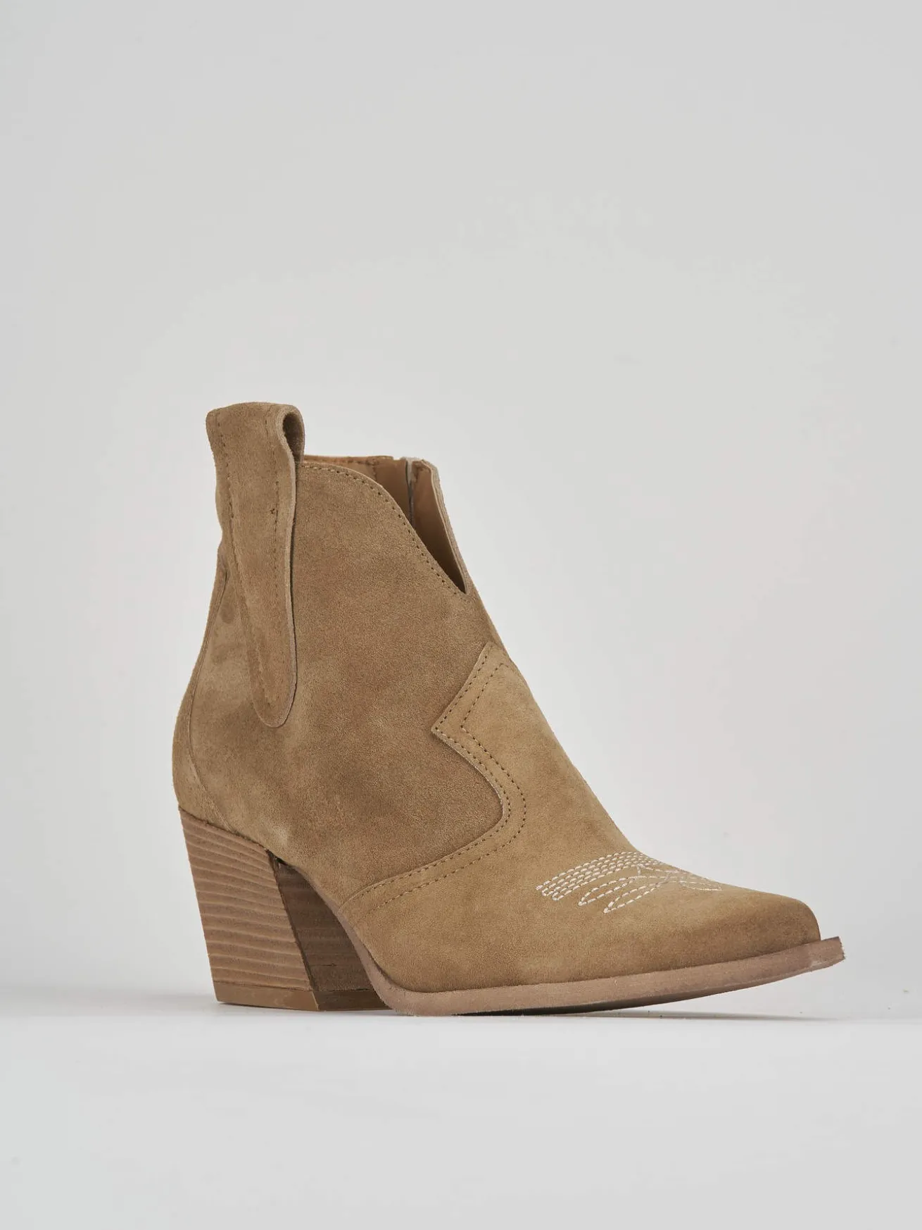 Stivaletto texano tacco 7cm fondo in leggera gomma e soletto interno in vera pelle. Tomaia in pelle scamosciata con ricami a contrasto. Ghette laterali e nuovo tacco per i tuoi tex look piu’ cool!