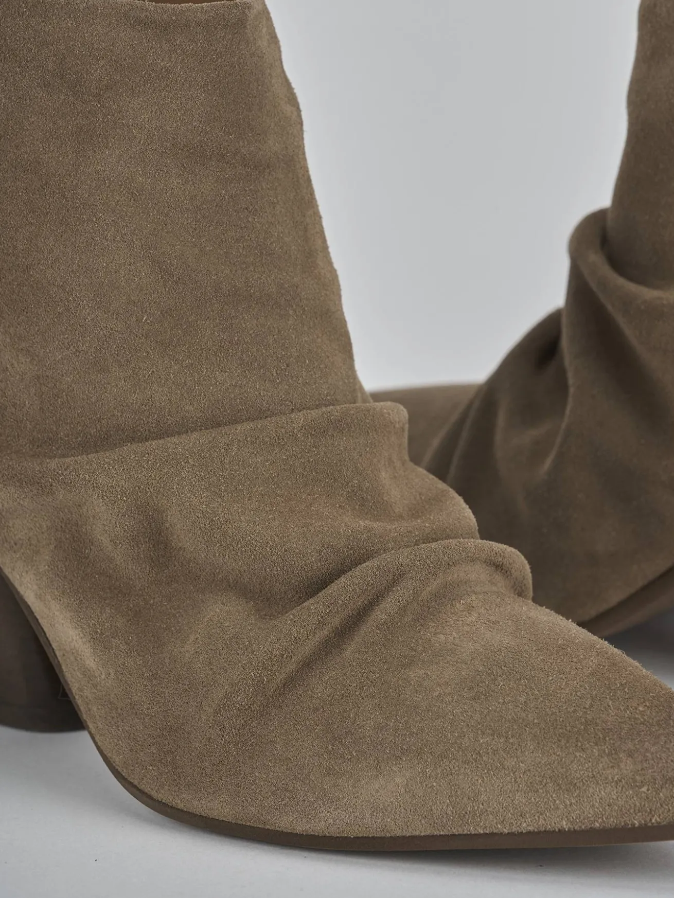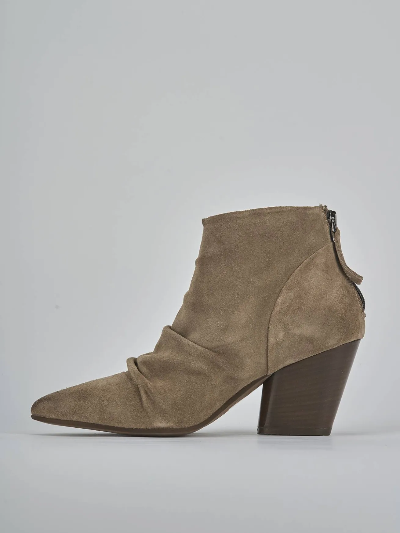 Stivaletto tacco 7 cm fondo in leggera gomma e soletto interno in vera pelle. Tomaia in morbido camoscio, punta sfilata, arricciato leggermente sul collo del piede, cuciture a mano, comoda cerniera posteriore e tacco cubano. Perfetto per qualsiasi tuo outfit.