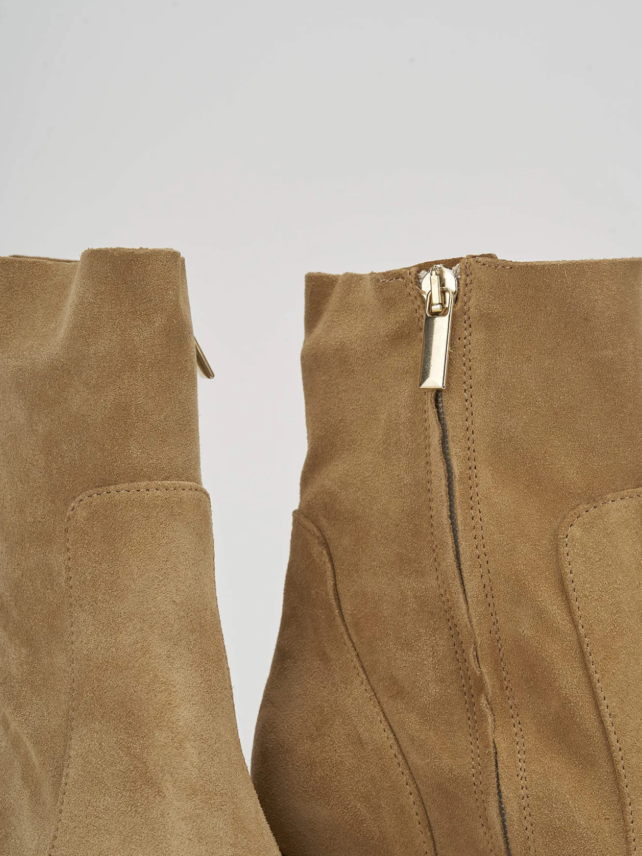 Stivaletto tacco 7 cm fondo in cuoio e soletto interno in vera pelle. tomaia in morbido camoscio, punta sfilata, cerniera laterale, cuciture in rilievo, tacco cubano. dalle linee eleganti sono una novità da aggiungere ai tuoi look.