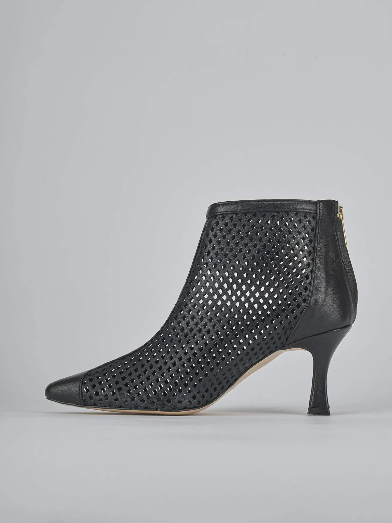 Stivaletto tacco 7 cm fondo in leggera gomma e soletto interno in vera pelle. Tomaia in morbida pelle forata, punta sfilata, puntale ton sur ton, liscio, comoda cerniera posteriore e tacco rocchetto per un look chic.