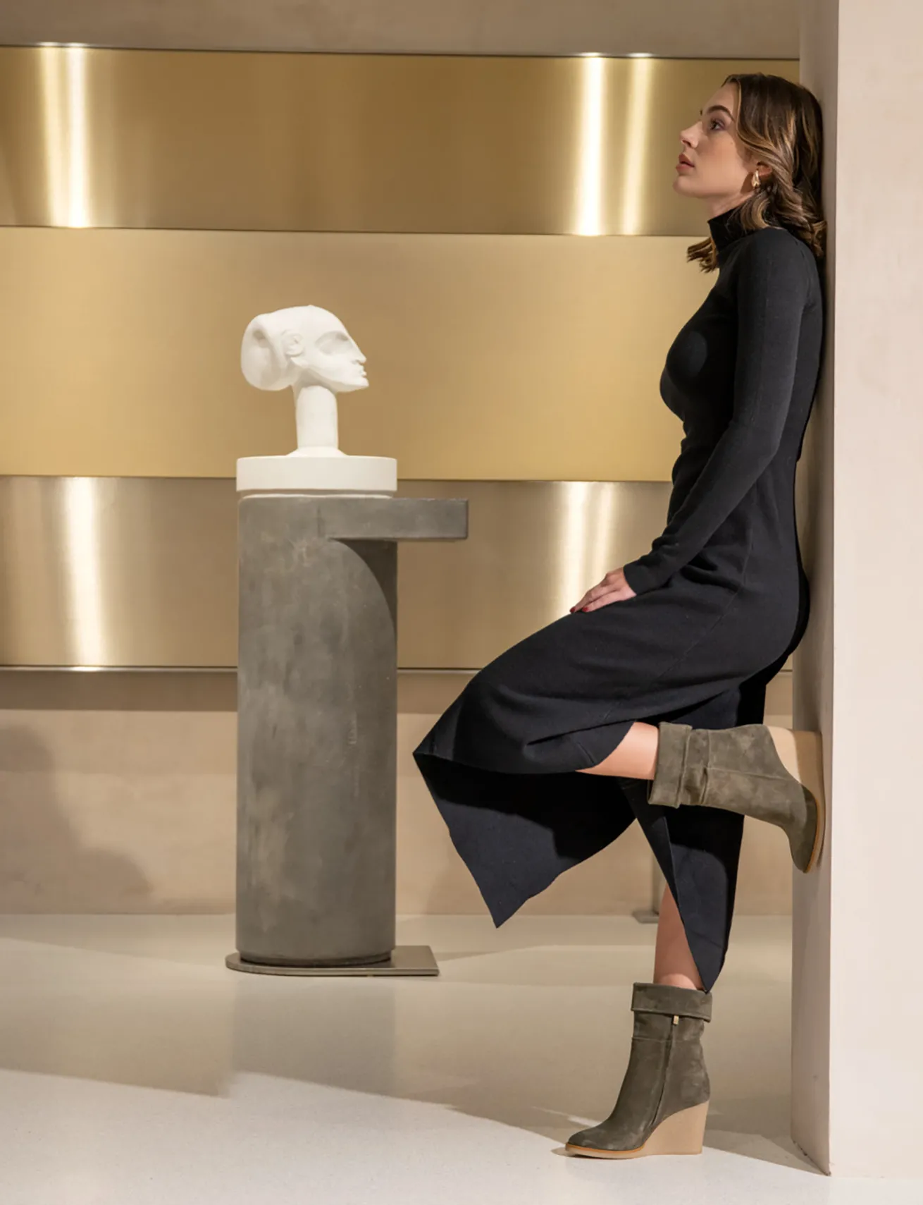 Stivaletto zeppa 8 cm fondo in gomma e soletto interno in vera pelle. Tomaia in morbido camoscio, punta tonda, comoda cerniera laterale. dettaglio di risvolto altezza caviglia e zeppa a contrasto con 1 cm di plaetau anteriore per un look cool.